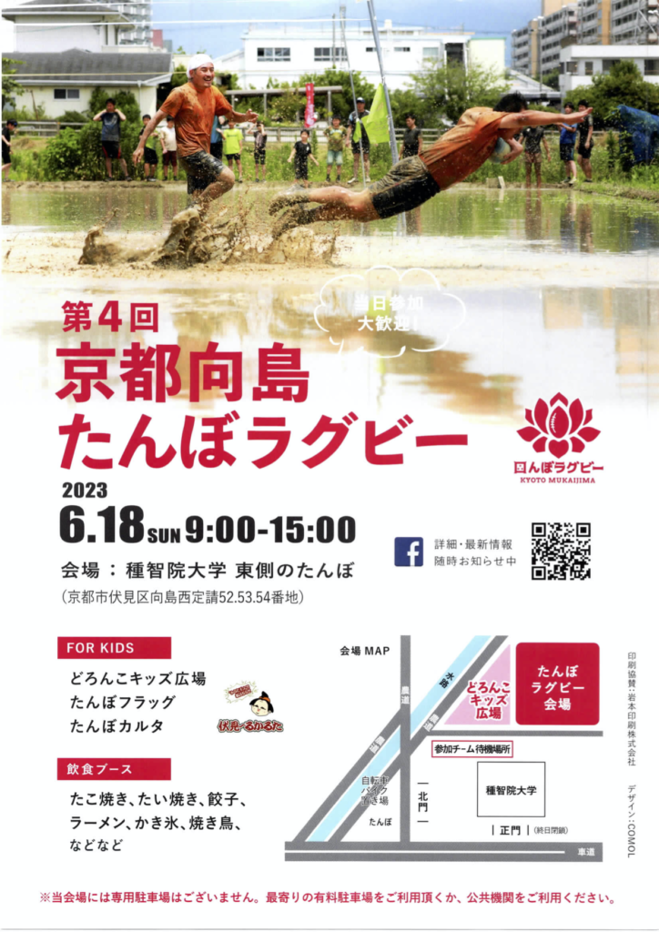 2023年6月18日(日)、京都市伏見区向島の田んぼにて開催される「第4回たんぼラグビー in京都向島」に、京都府出身の選手・スタッフで参加します。