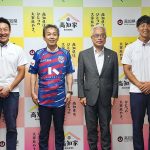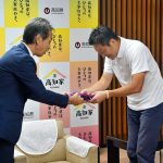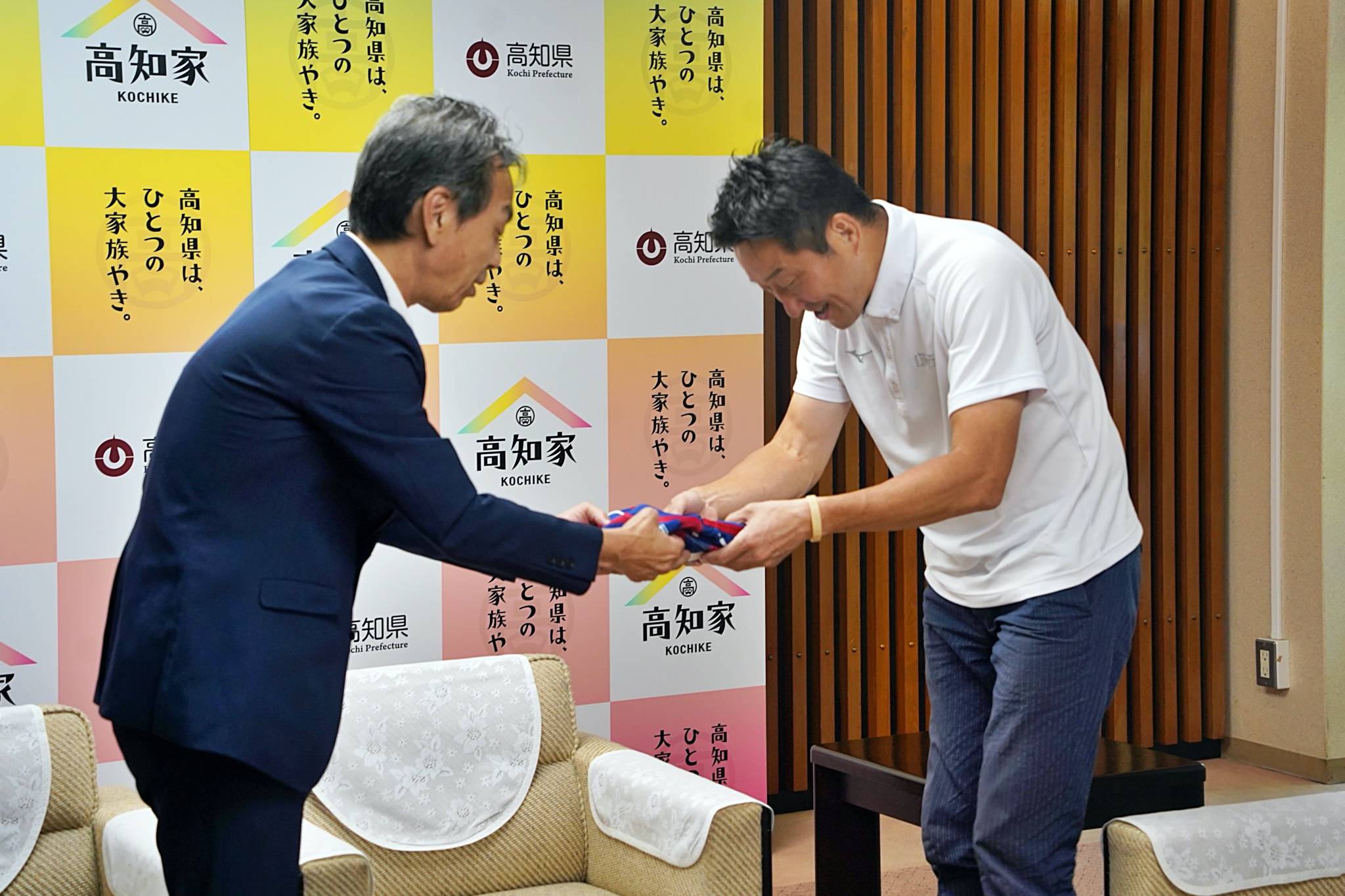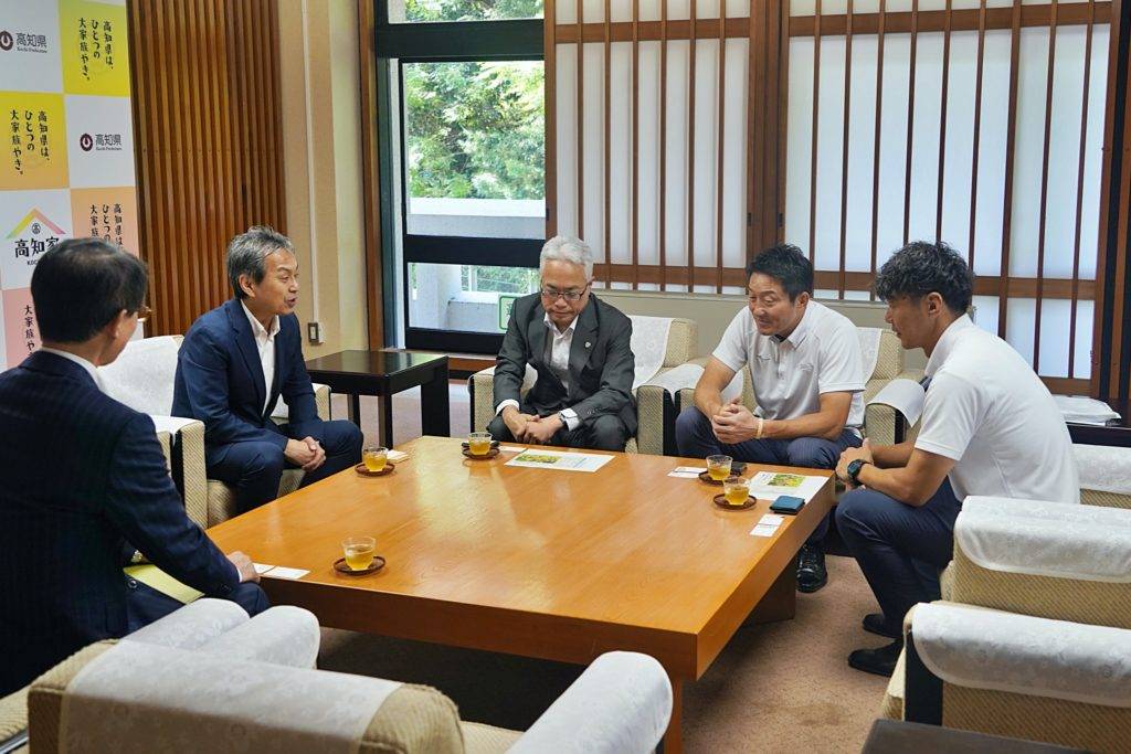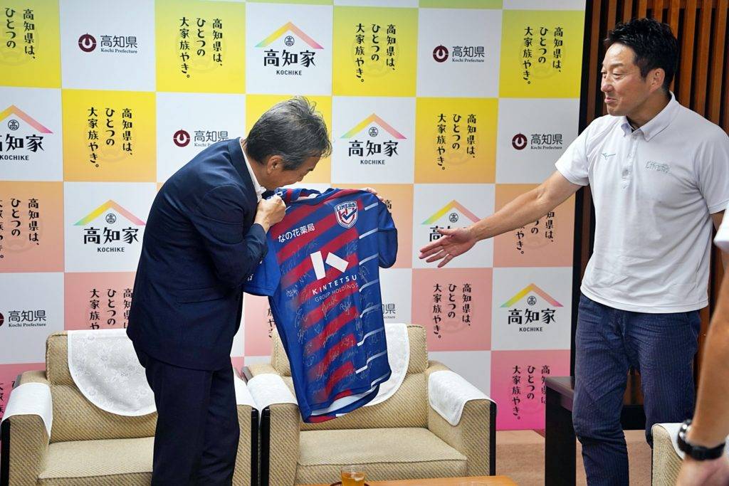 飯泉GMが「宿舎やグラウンドがとてもきれいで食事もおいしい。本当に良い環境で合宿をさせていただいています」と話すと井上副知事からは、「高知のおいしいものを食べて合宿がんばってください。応援しています」と激励いただきました。