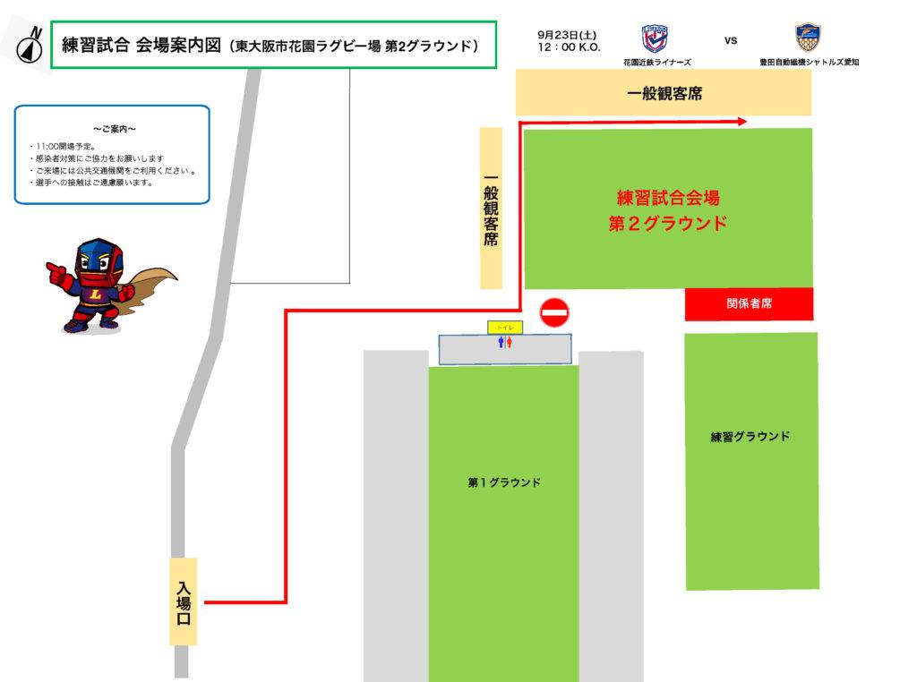 来る9月23日(土)、東大阪市花園ラグビー場第2グラウンドにて開催の花園近鉄ライナーズvs豊田自動織機シャトルズ愛知のプレシーズンマッチについて、会場のご案内です。
