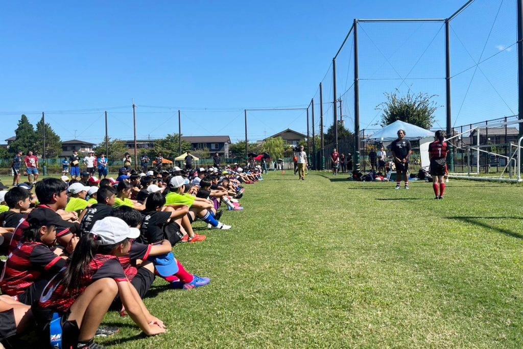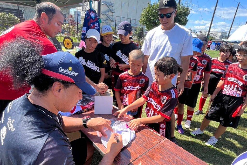 青空の元、多くの子どもたちとタグラグビーで交流し、最後にはサイン会も。