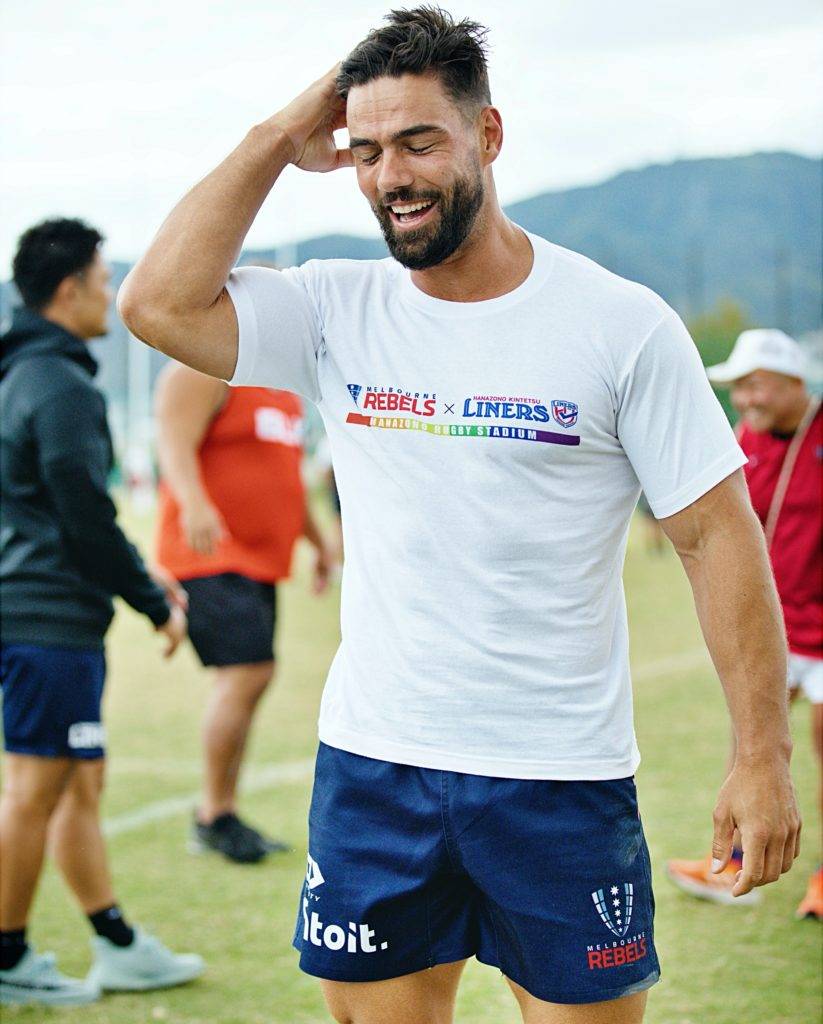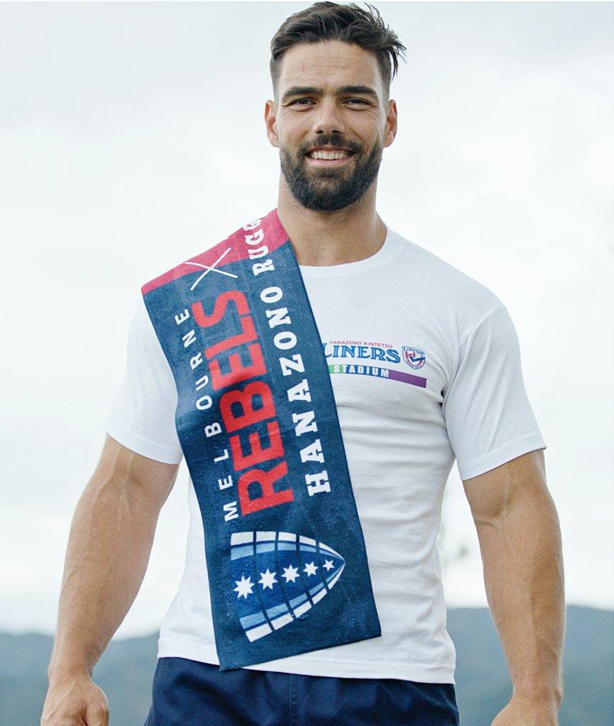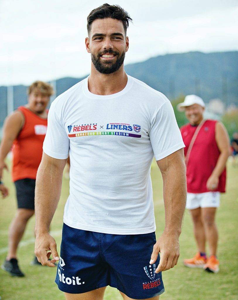 今回のモデルはレベルズ所属のスクラムハーフ、ライアン・ローレンス選手。元ライナーズの選手ということもあり、快く引き受けてくださいました。