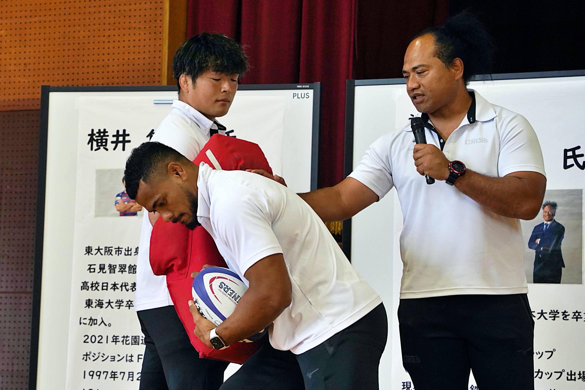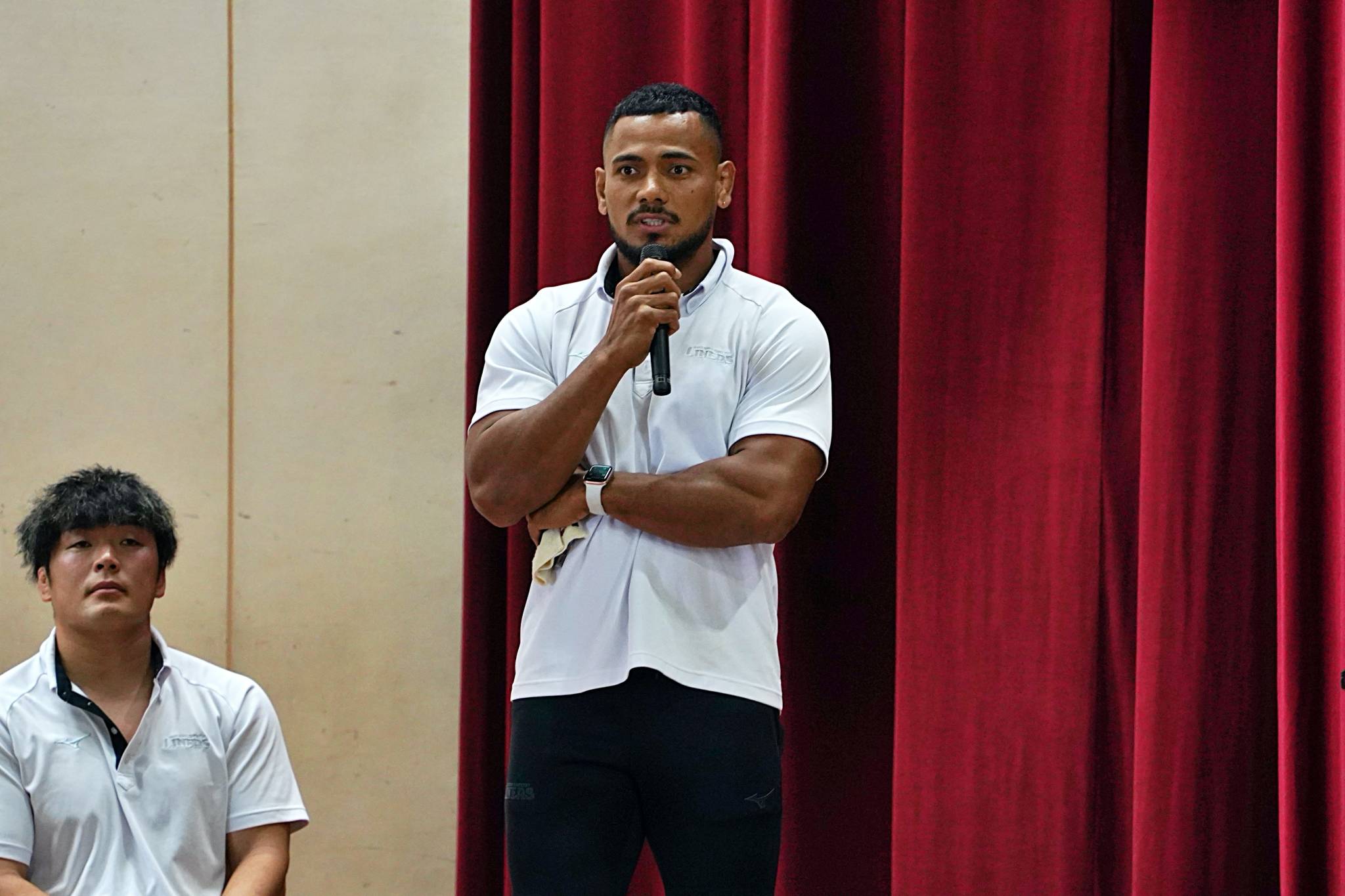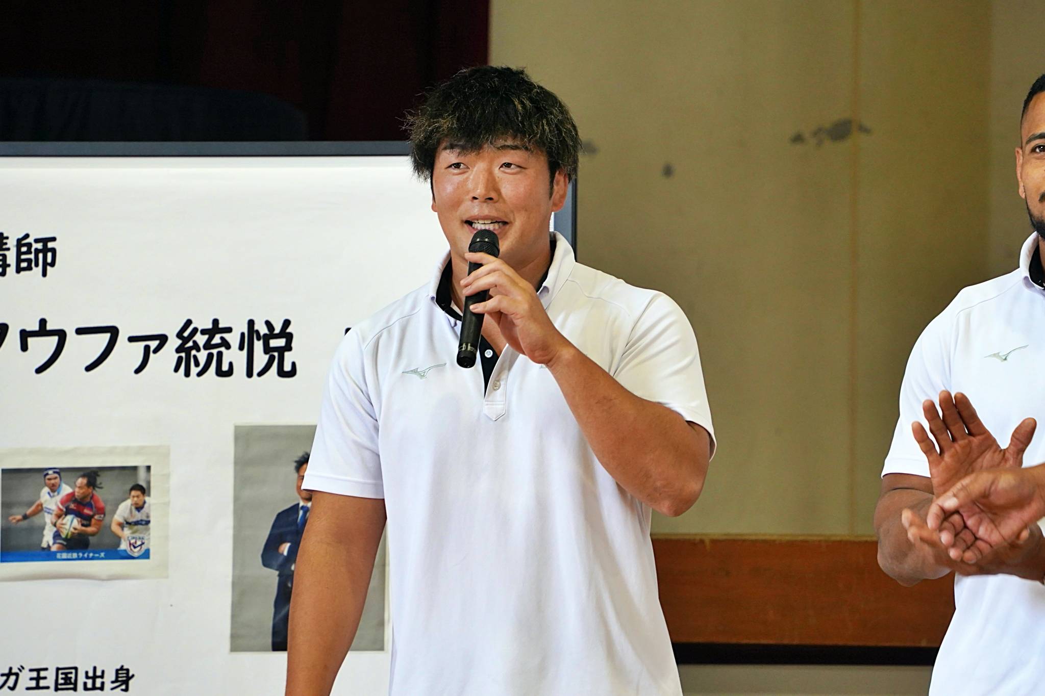 講話の前にタックル体験やラインアウト体験など、少しラグビー体験をしてから講話に。