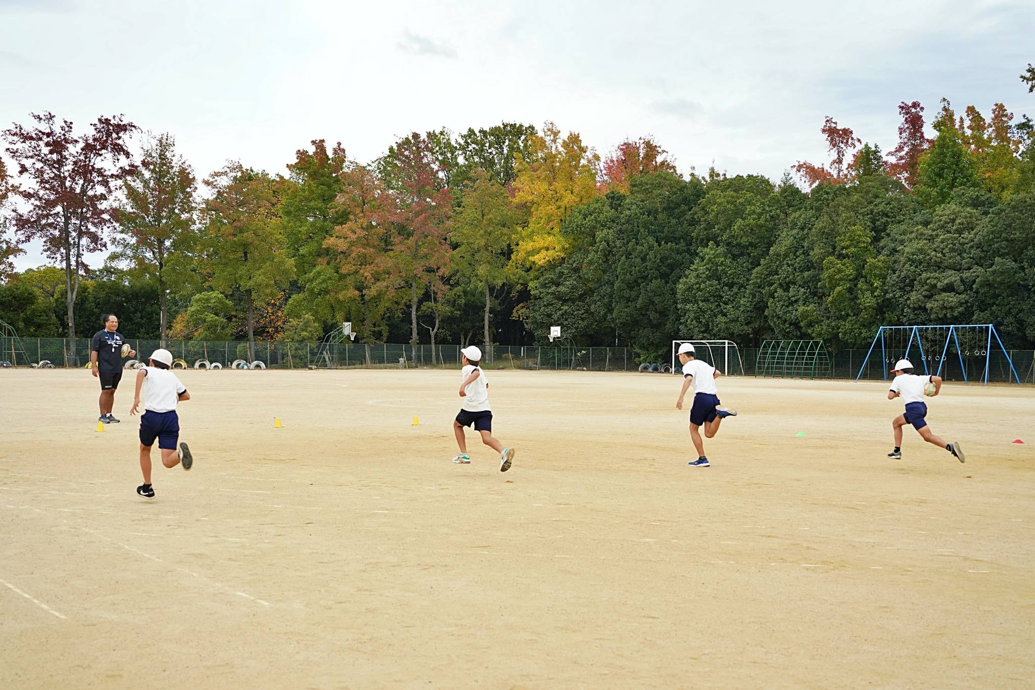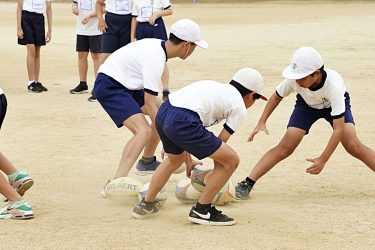 テーマは「協力」。はじめに協力についての講話をし、その後グラウンドに移動してラグビー体験を行いました。特にラグビーボールを使ったリレーでは、全員が声を出して最後の児童がゴールするまで応援していて、しっかり協力できていました。