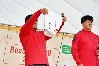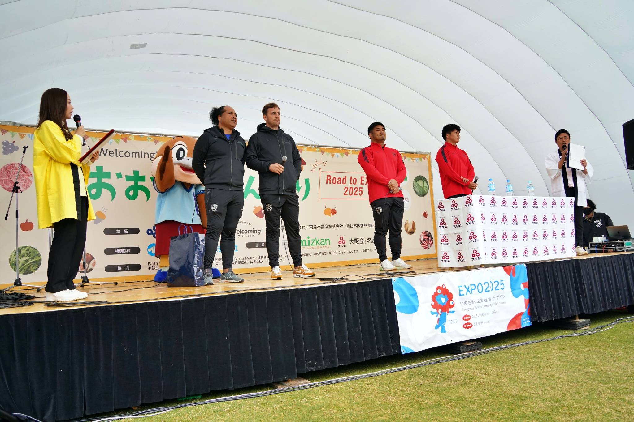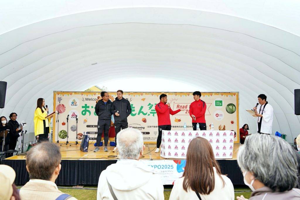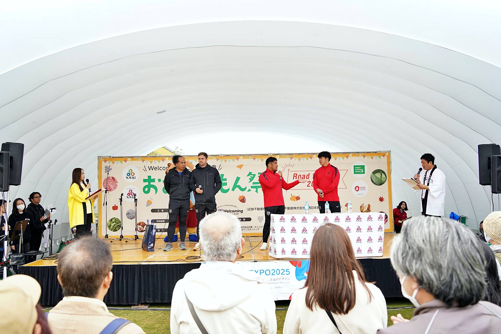 佐々木駿、梅村柊羽、ジェド・ブラウンの3選手が参加。大阪産(もん)に関するトークショーや大阪産(もん)の食レポを行い、会場を盛り上げました。