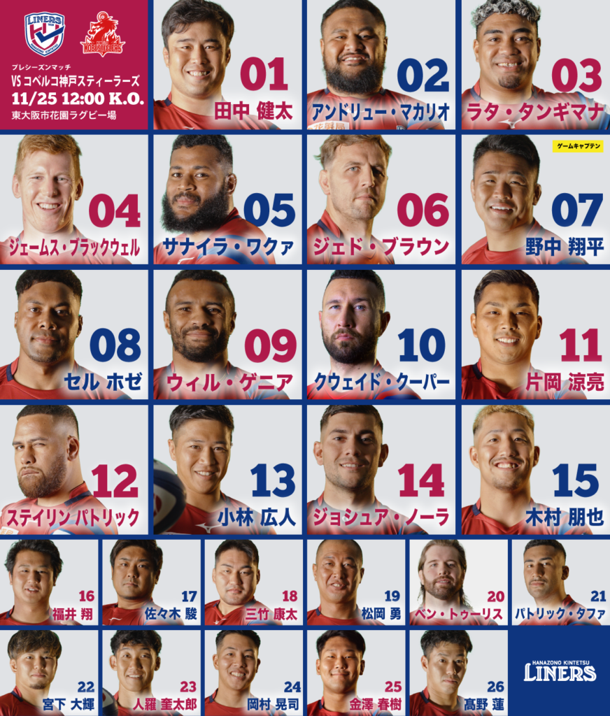 11月25日(土)12:00 K.O. vsコベルコ神戸スティーラーズ