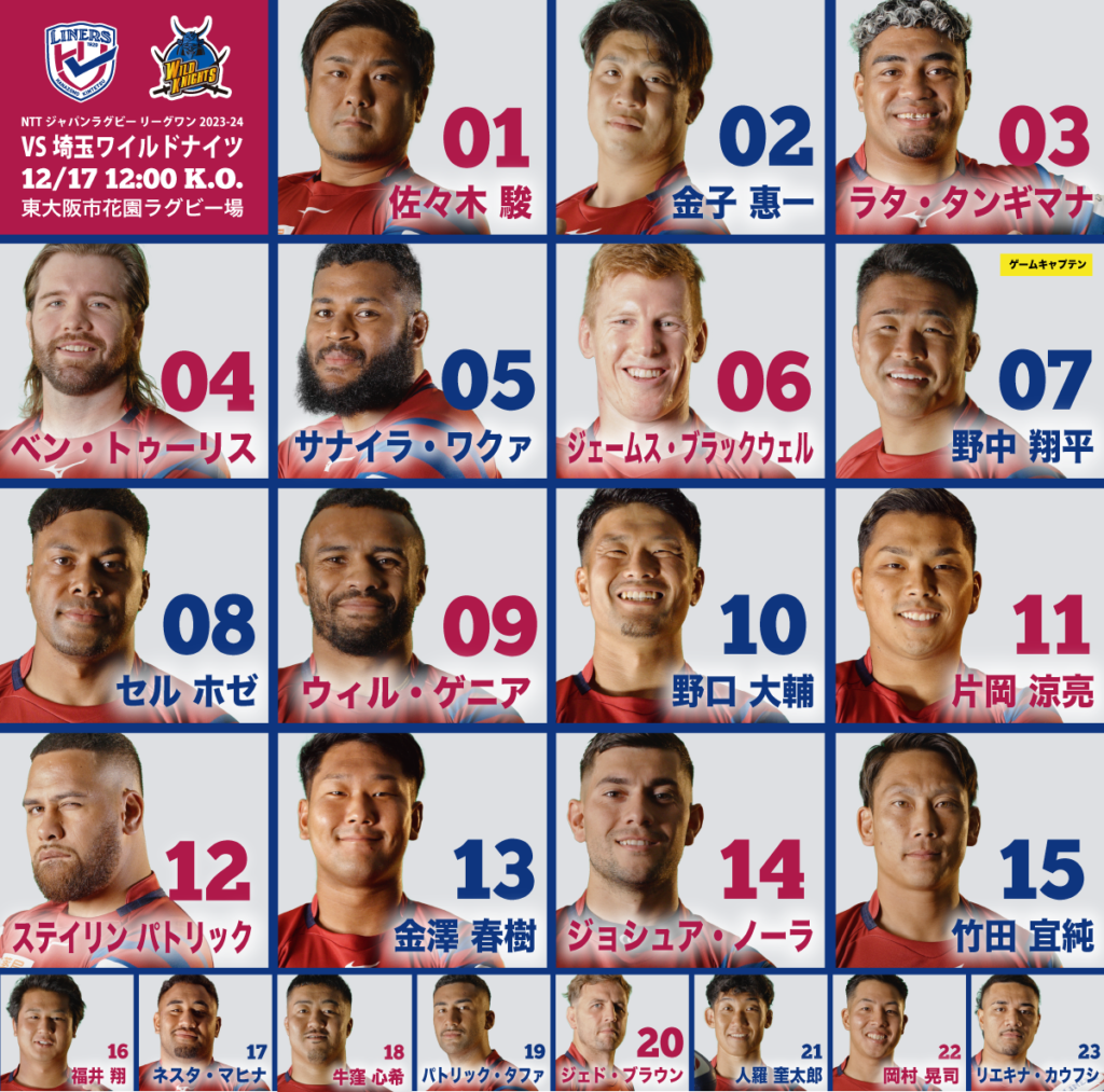 来る12月17日(土)12時00分キックオフのNTT JAPAN RUGBY LEAGUE ONE 2023-24 Div.1 第2節(ホスト開幕戦)「埼玉ワイルドナイツ」戦のご案内をいたします。