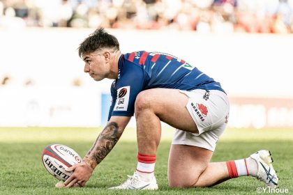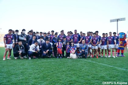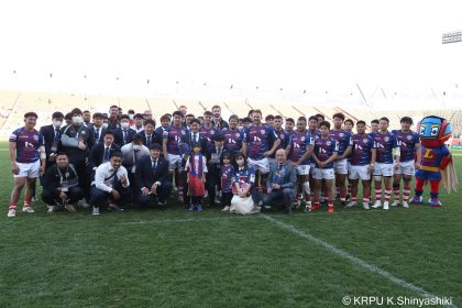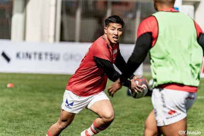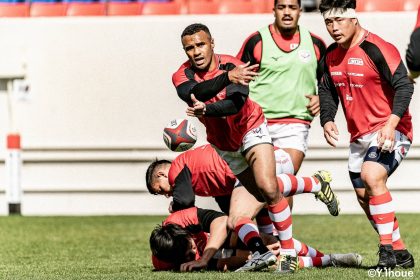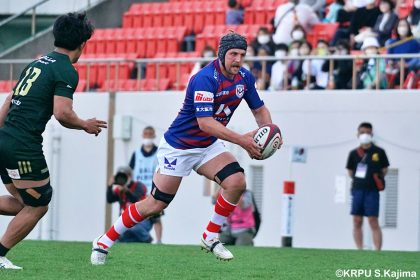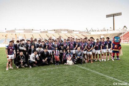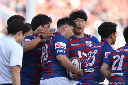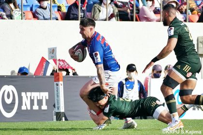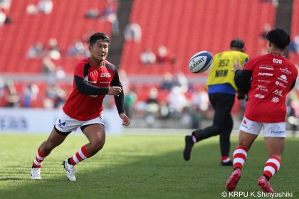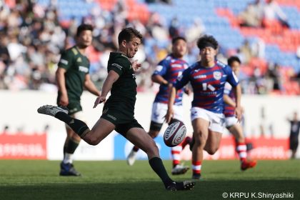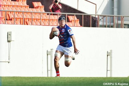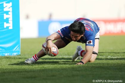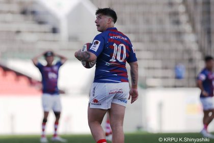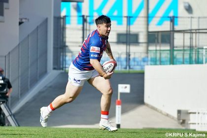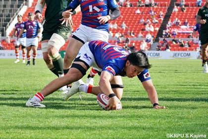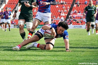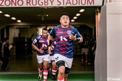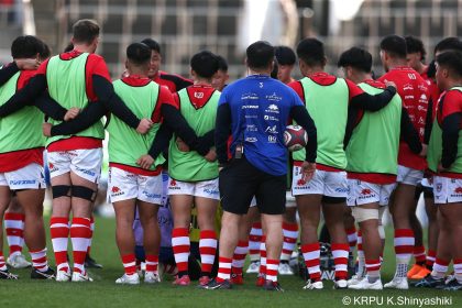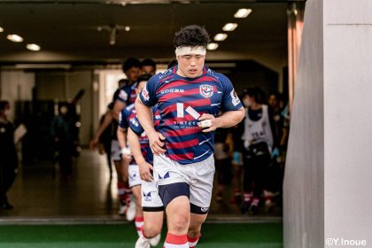 22金澤のタックルや17井上のジャッカルなどアーリーエントリーの選手が勢いをつけ、元気が戻ってきた後半25分。ラインアウトから連続アタックを仕掛けると、21中村、7野中、20ジェドと近場でつないで最後はバショップが中央にトライを決めます。自らGを決めて24-45。