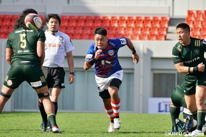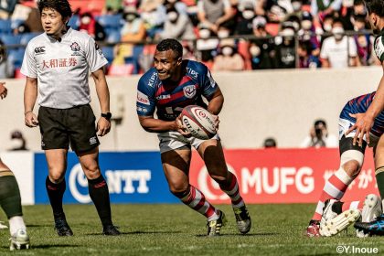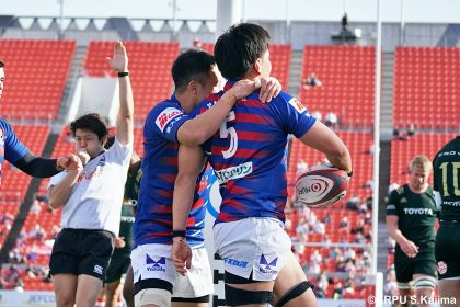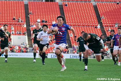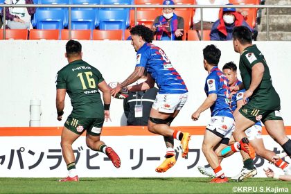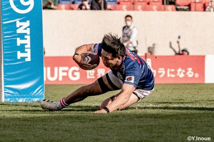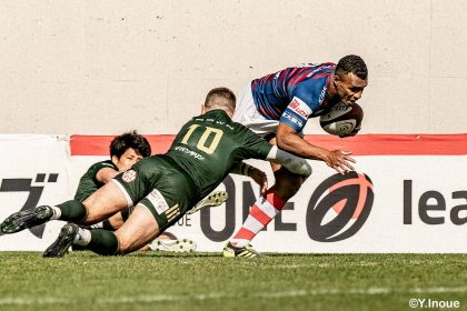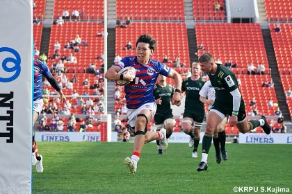 後半最初のトライを奪われ33-10でリスタートした後半16分。センターラインでの攻防で相手にプレッシャーをかけボールを手に入れたライナーズは、12岡村に渡るとゲイン。そこからサポートに入った9ゲニア、5菅原とつないでトライをもぎ取ります。