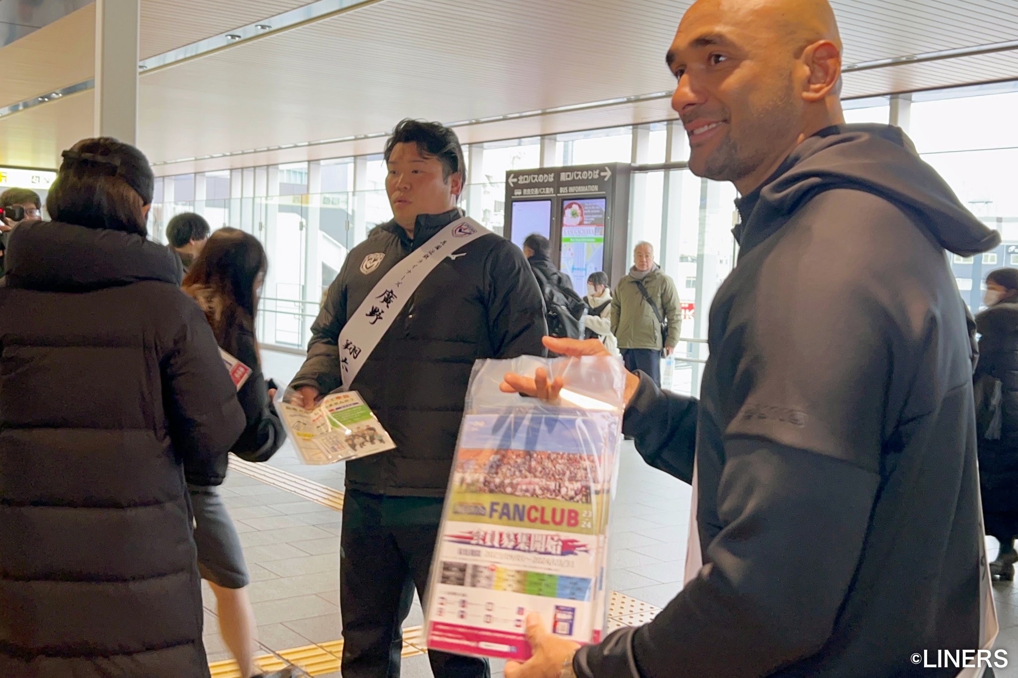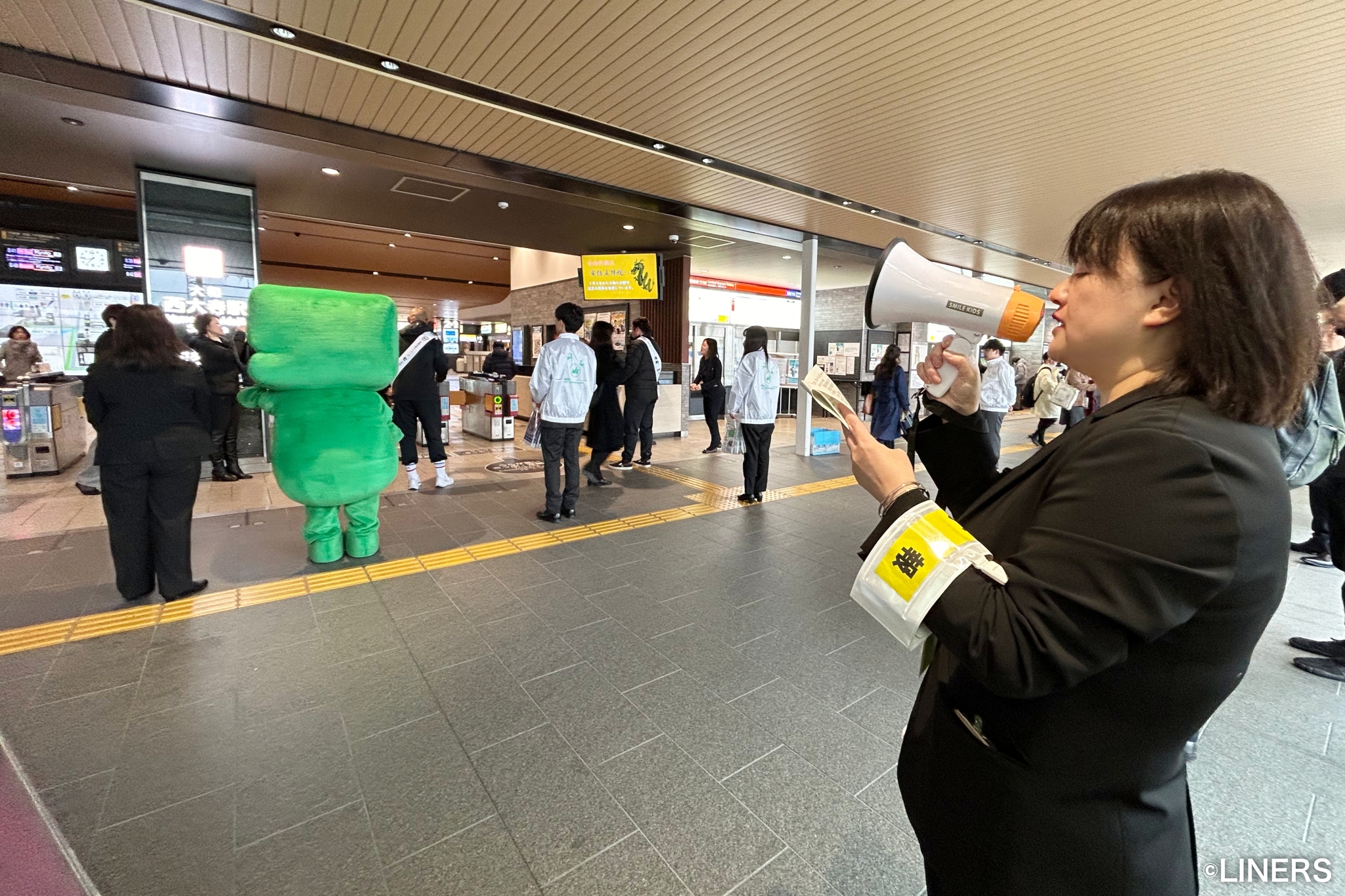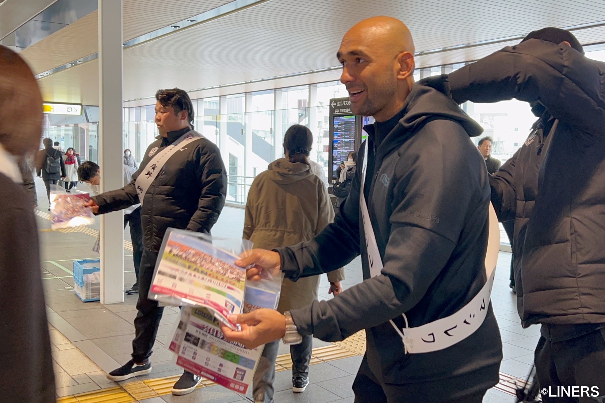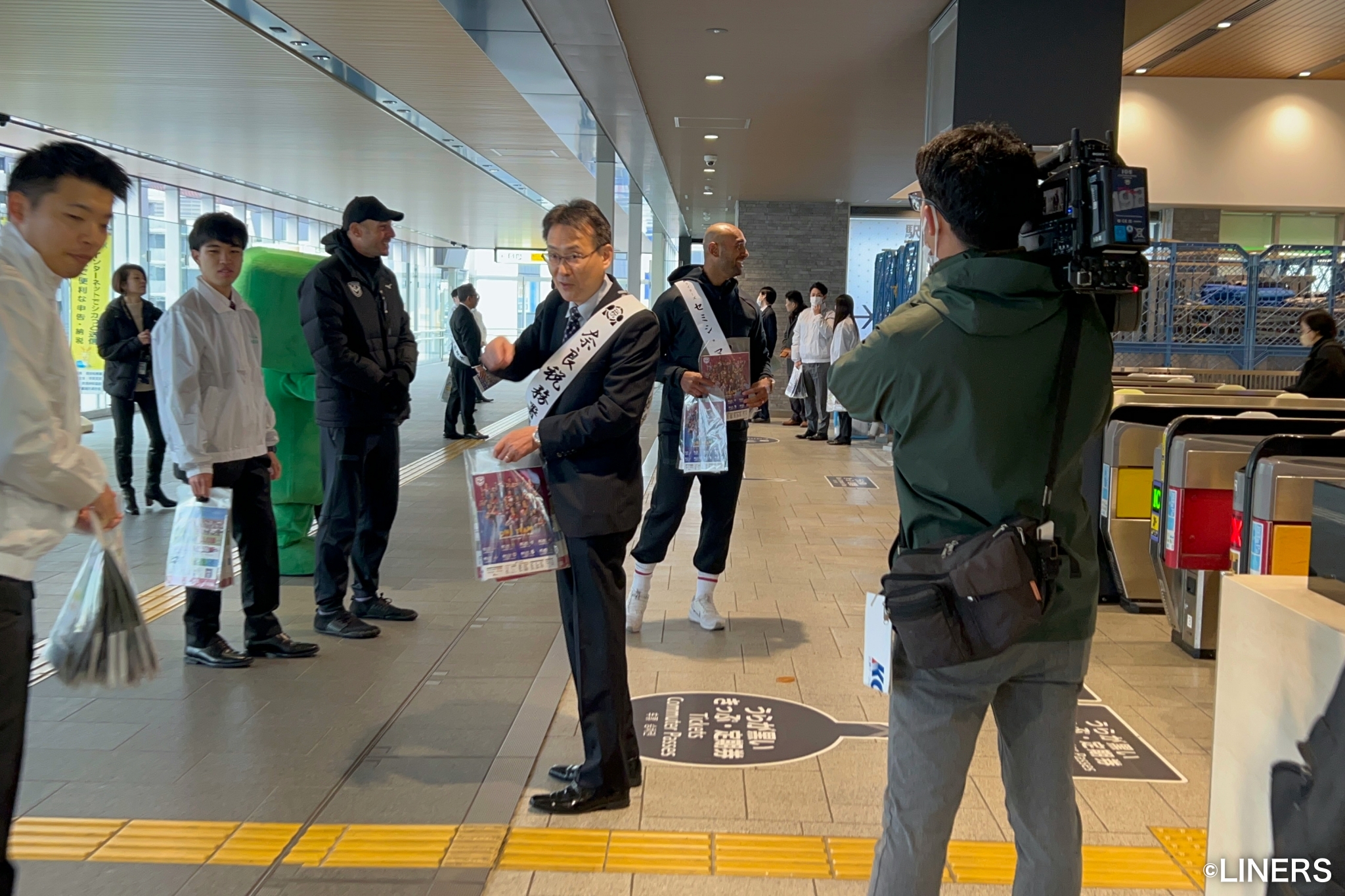 朝の通勤ラッシュに合わせセミシ・マシレワ選手と廣野翔太選手が啓発品を配布し、行き交う人々の目を引きました。