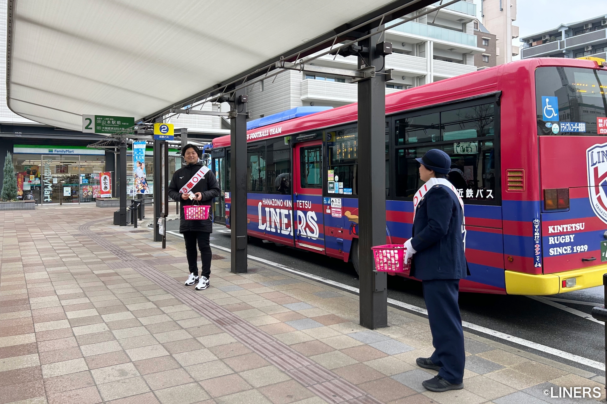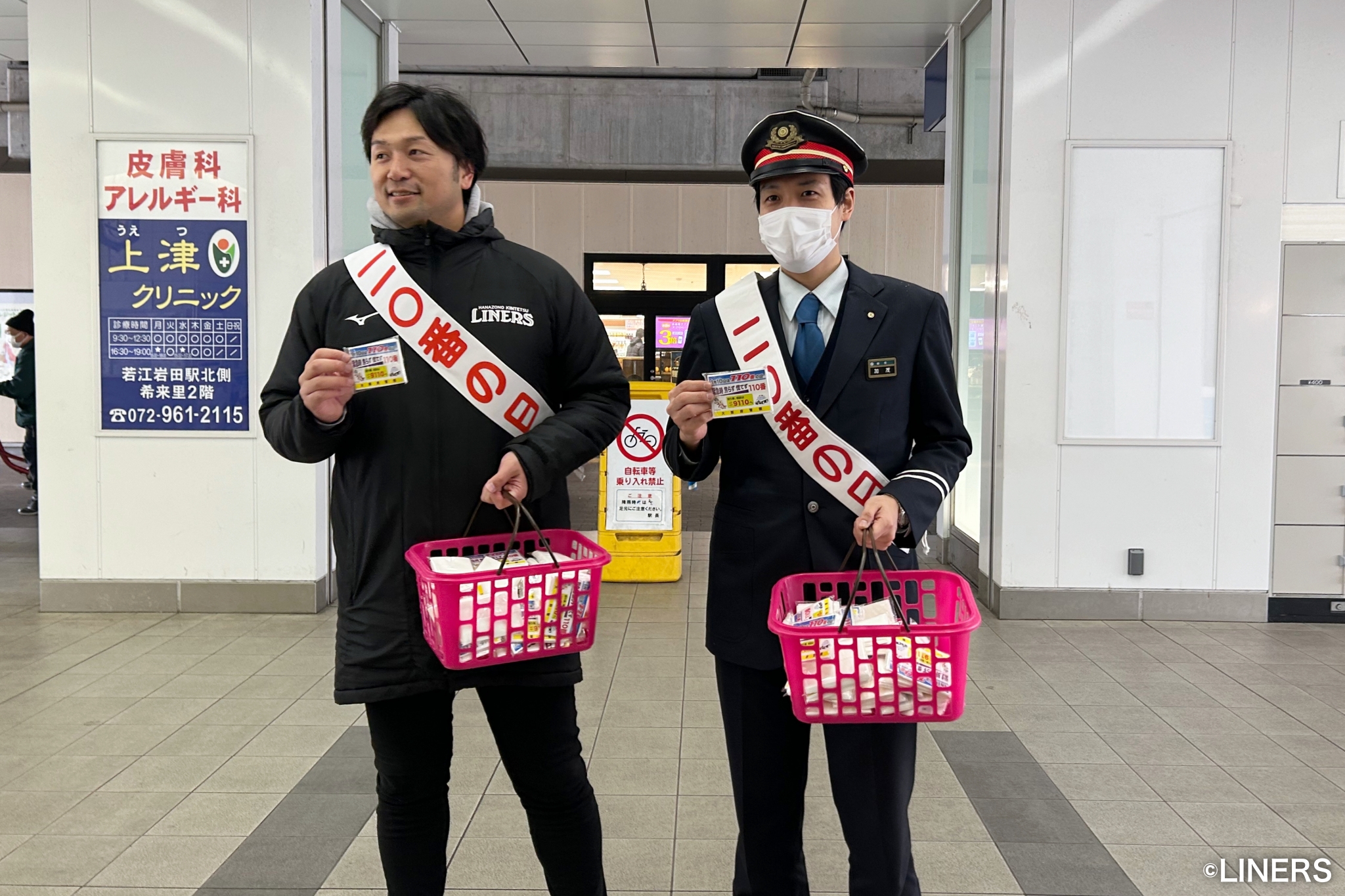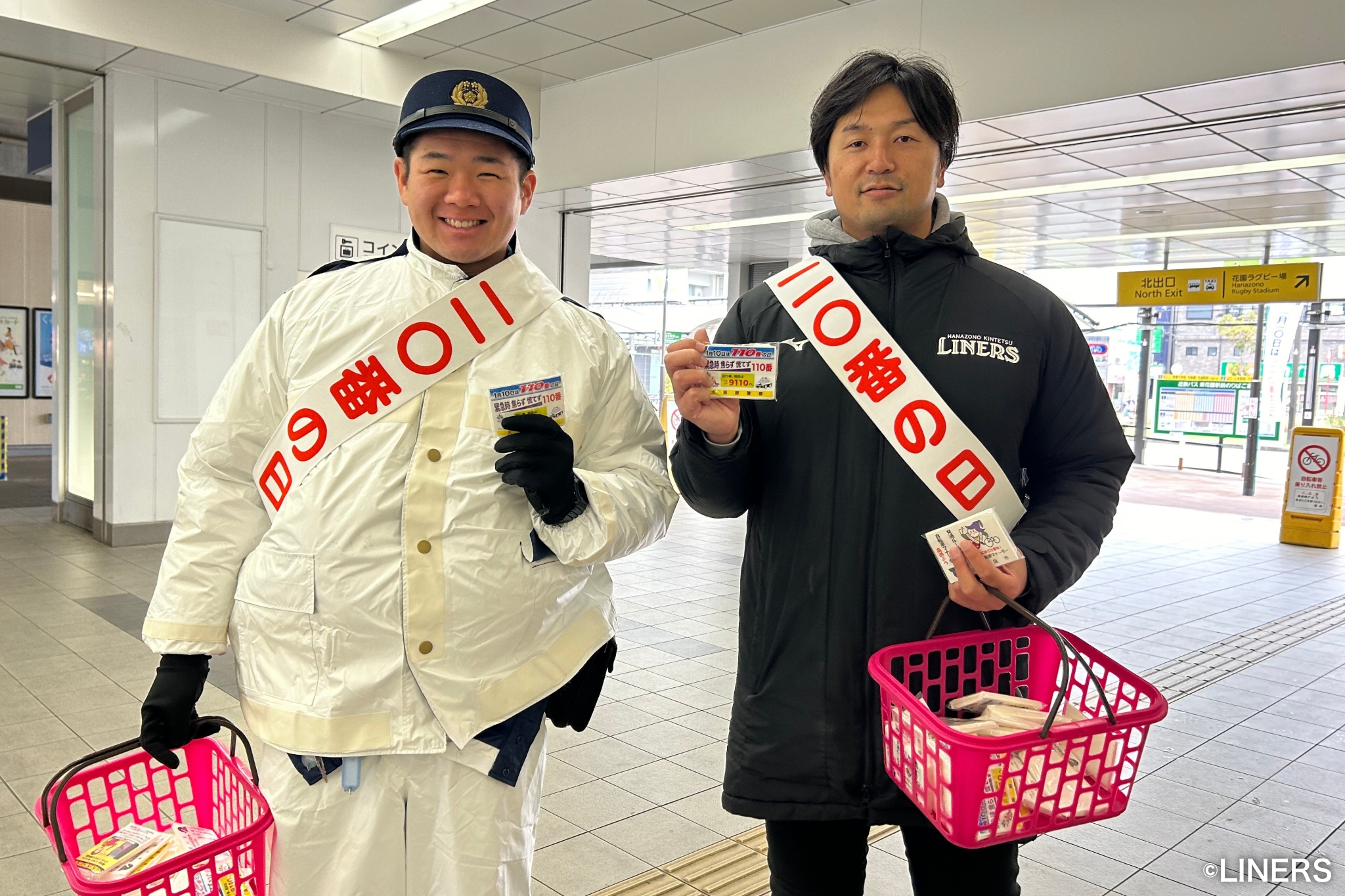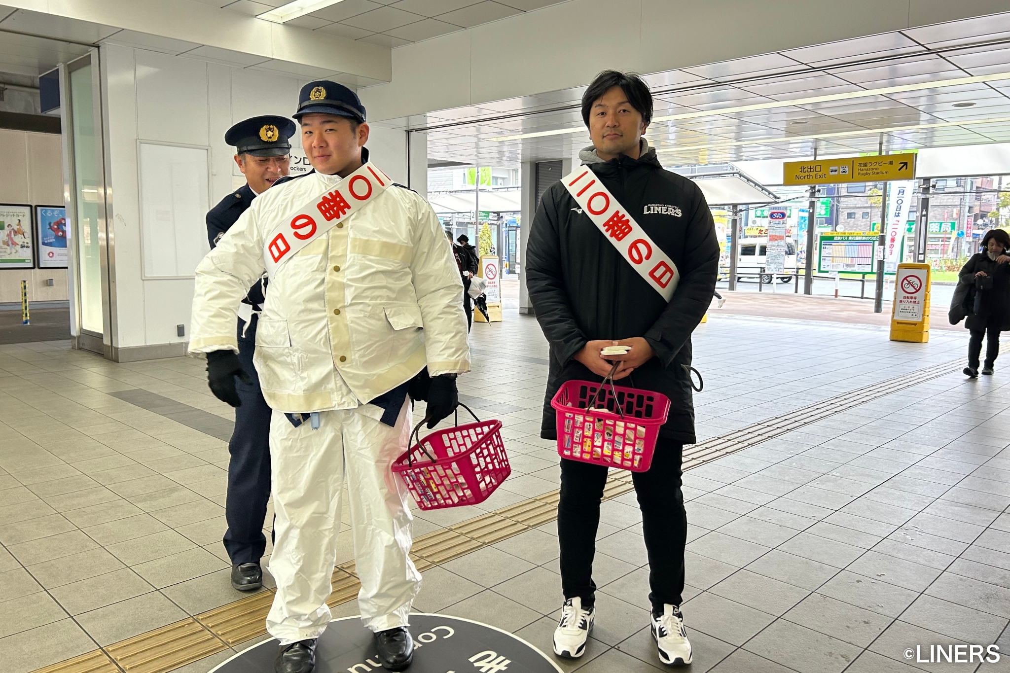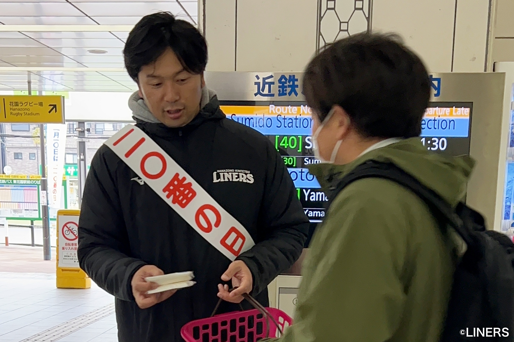 1月10日(水)、花園近鉄ライナーズは東花園駅にて河内警察署が実施する「110番の日」の啓発活動に参加しました。