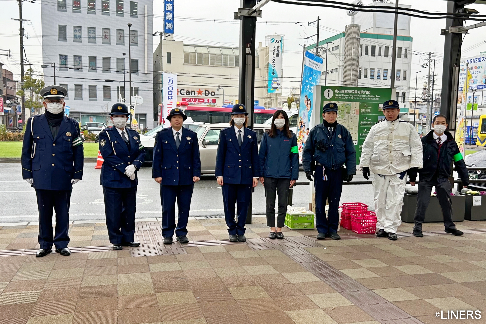 村下雅章総括が警察署の皆さまとともに正しい110番通報を呼びかけ、啓発品を配布。