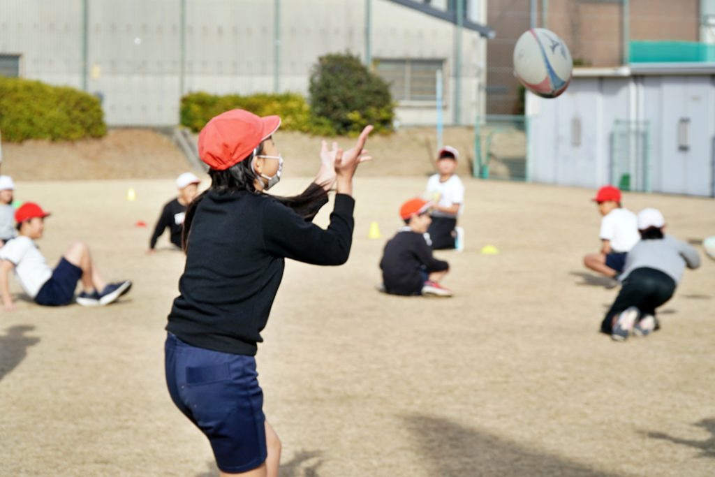 6年生にラグビー体験を実施。みんなで「One Team」の意味を考えることから始まり、タックル体験やパス体験、ラグビーボールを使ったリレーを行いました。ラグビースクールに通う児童もいて、みんなの前でタックルの披露も。2クラスに分かれての授業だったため、1クラス当たりの時間は限られていましたが、One Team で素早く行動してくれたお陰で、たくさんのゲームができました。