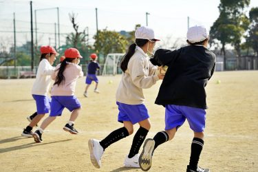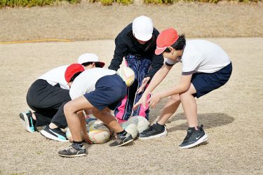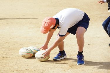 5年生にラグビー体験を実施。芝生のグラウンドでタックル体験やパス練習、ボールを使ったリレーなど1時間「One Team」をテーマに身体を動かしました。