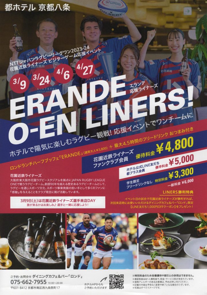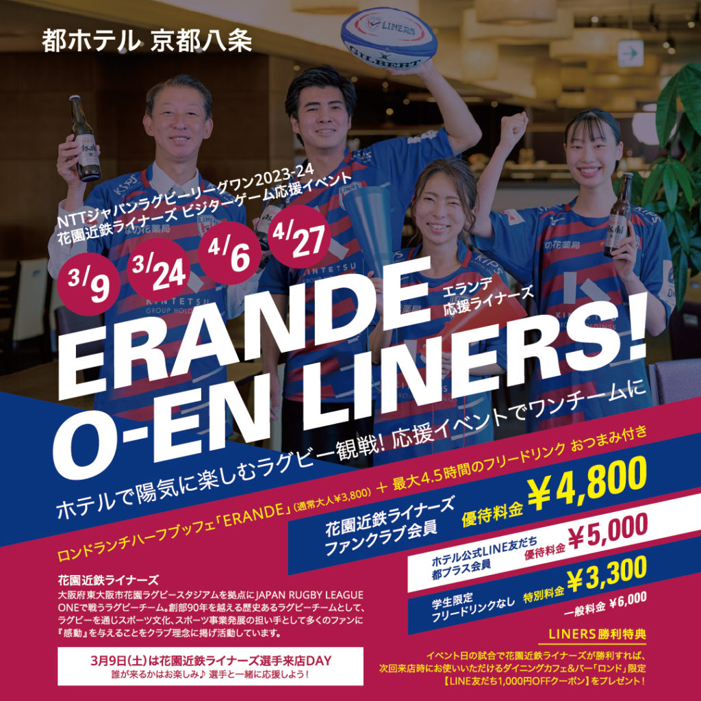 2024年3月9日(土)、24日(日)、4月6日(土)、27日(土)、都ホテル 京都八条 ダイニングカフェ&バー「ロンド」にてビジターゲーム応援イベント「ERANDE O-EN LINERS!」が開催されます。