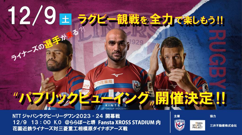 12月9日(土)NTTジャパンラグビーリーグワン2023-24 開幕戦 vs三菱重工相模原ダイナボアーズに合わせ、「大阪スポーツコミッション (OSAKA SPORTS PROJECT)」との連携企画として、ららぽーと堺にてパブリックビューイングを実施します。