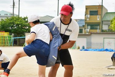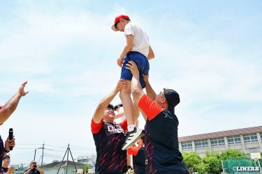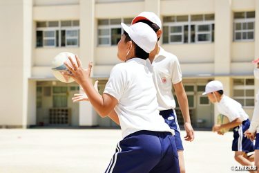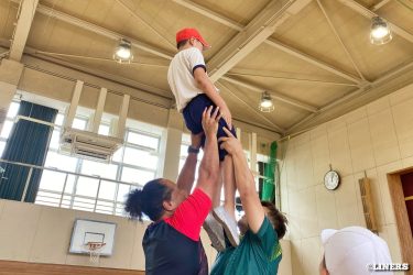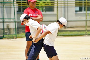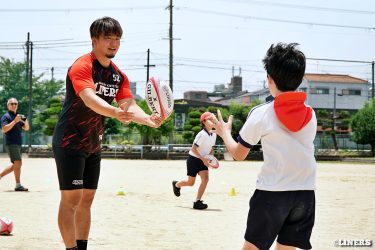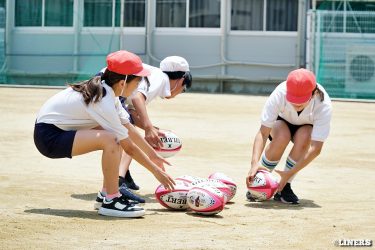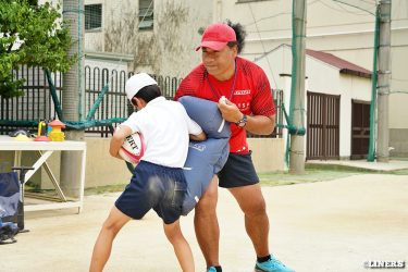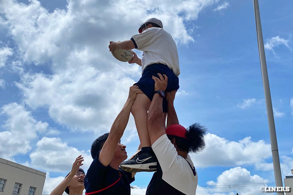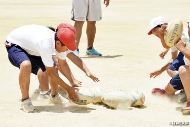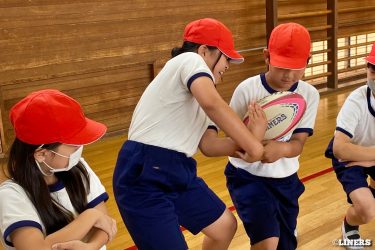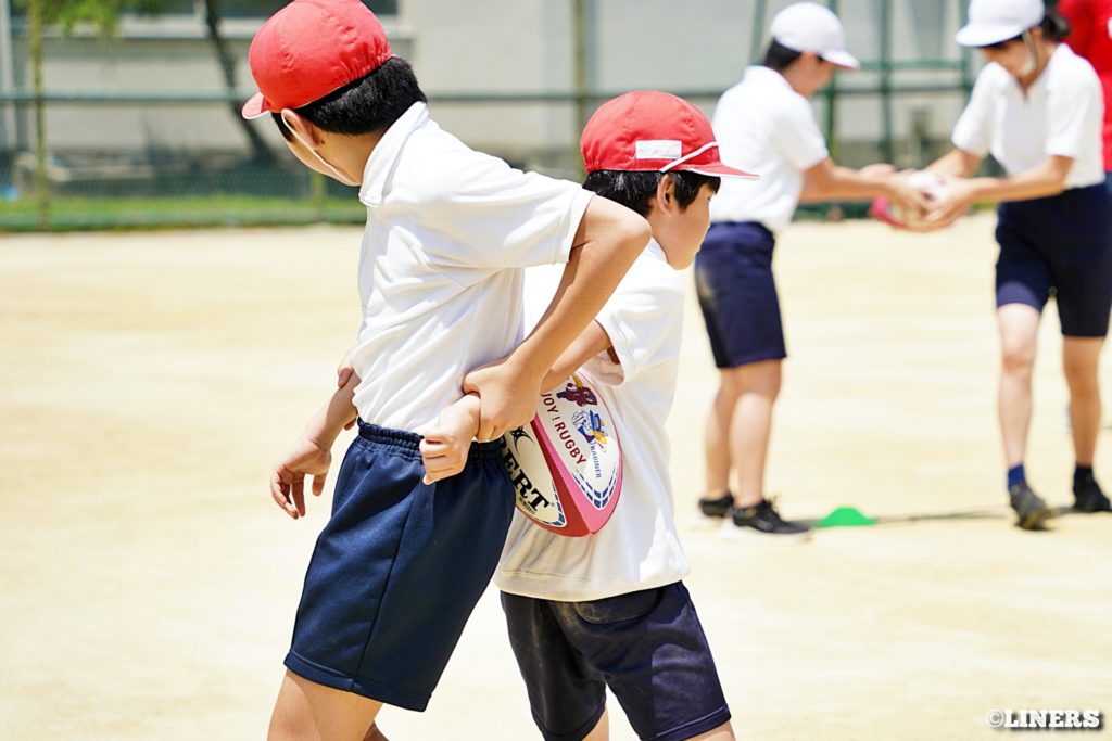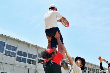 巽小学校の6年生にラグビー体験を行いました。学校の先生にラグビー経験者がいらっしゃったことから、この日はラインアウト体験も。普段なかなか体験できない高さに驚く児童のみなさんの表情が印象的でした。