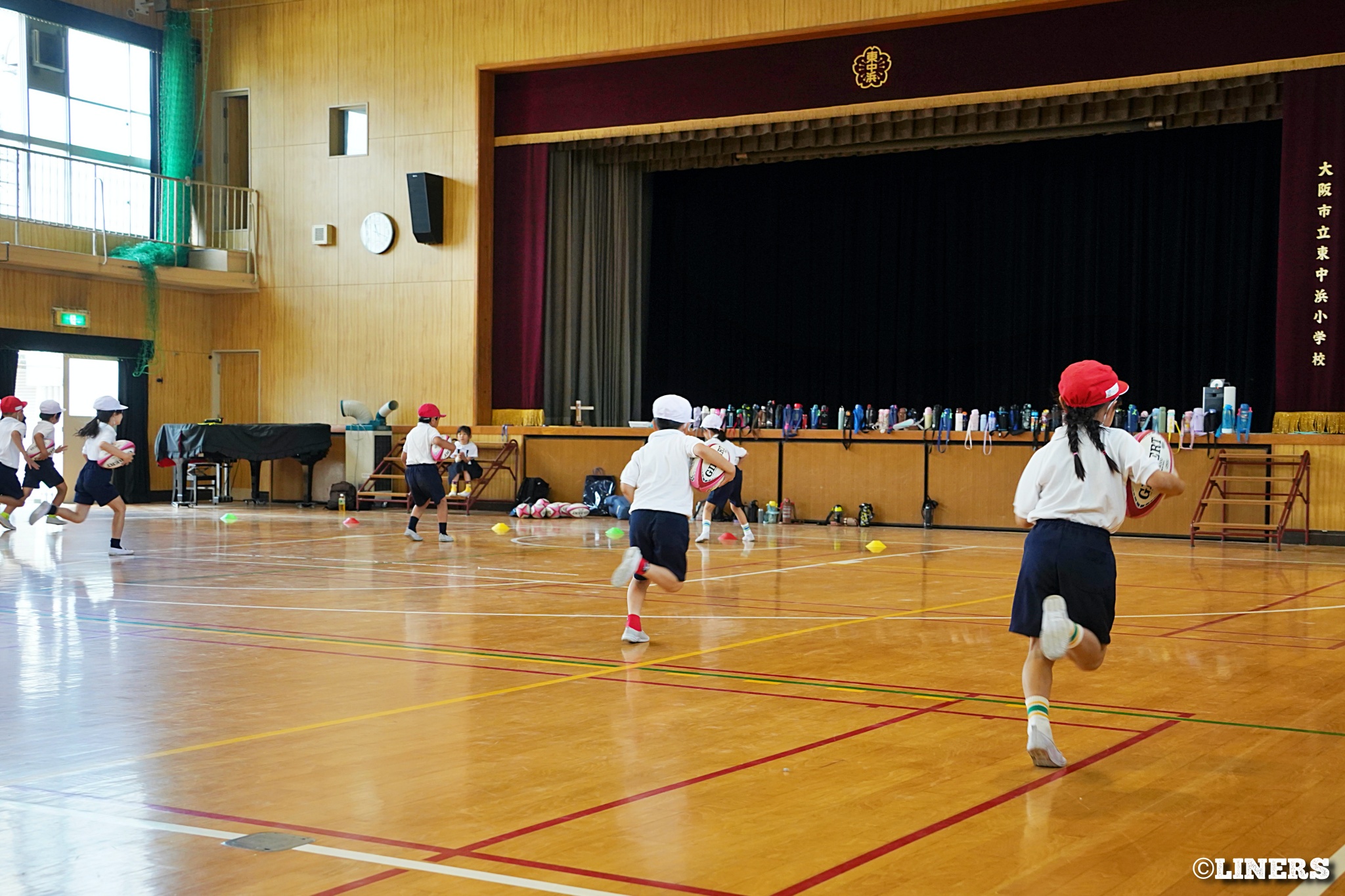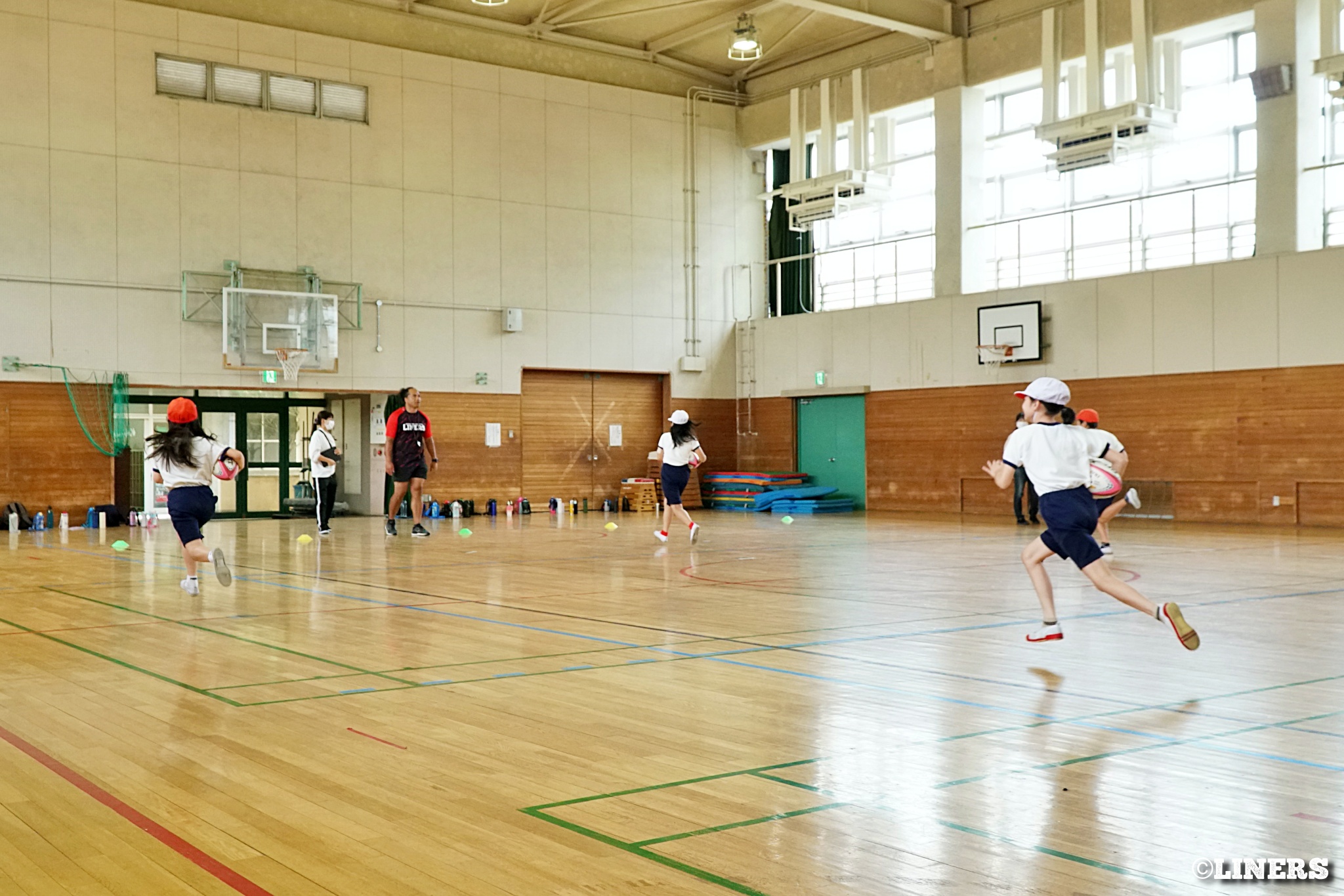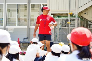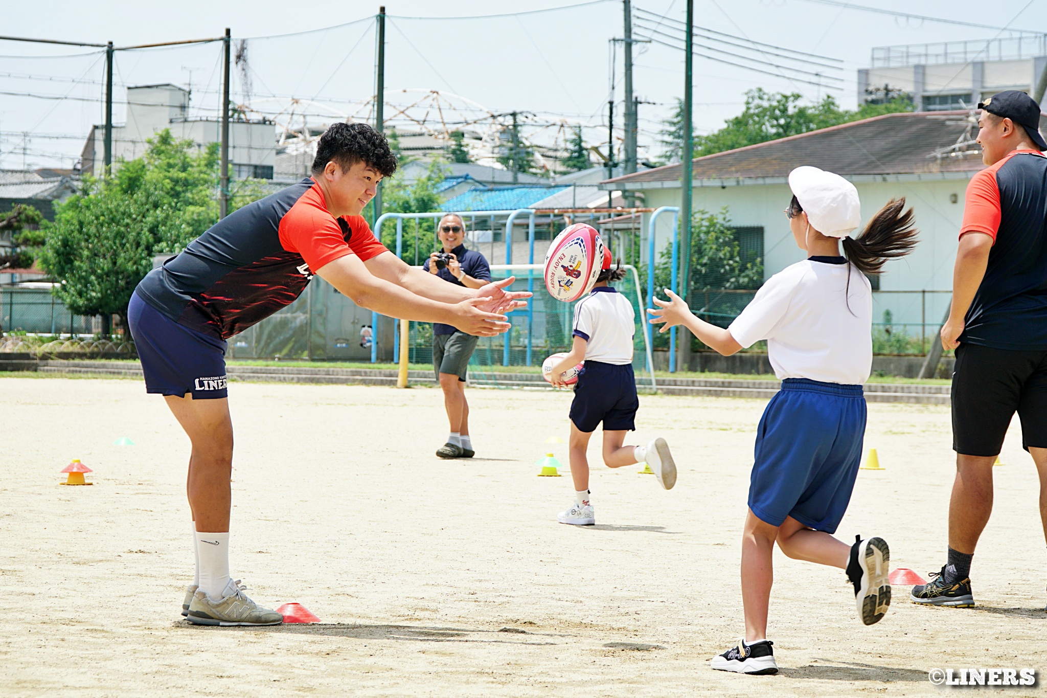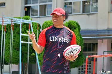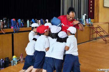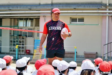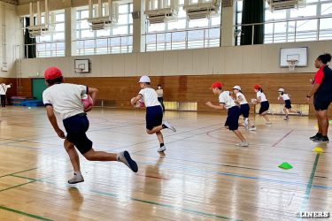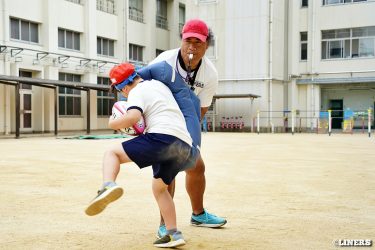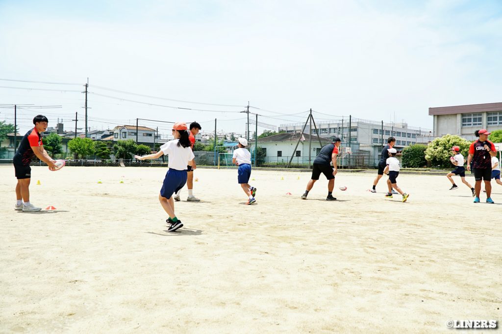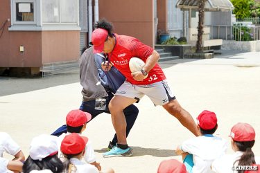茨田南小学校の6年生にラグビー体験を行いました。この日から普及活動用のラグビーボールを新調。ライナーズのマスコットキャラクター「ライナマン」とSNS広報担当の「ラビナーくん」があしらわれたボールです。新品のボールで児童のみなさんもテンションMAX。いつも以上にラグビー体験が盛り上がりました。