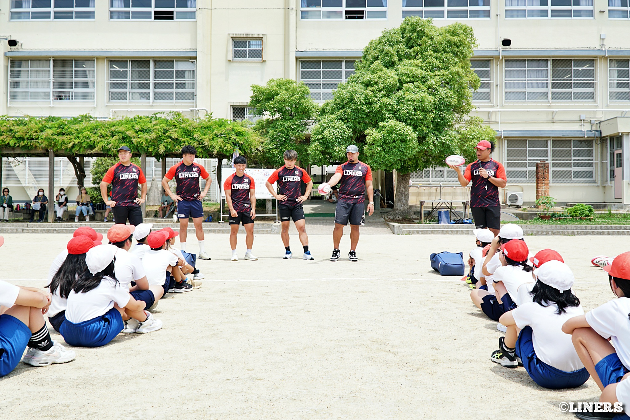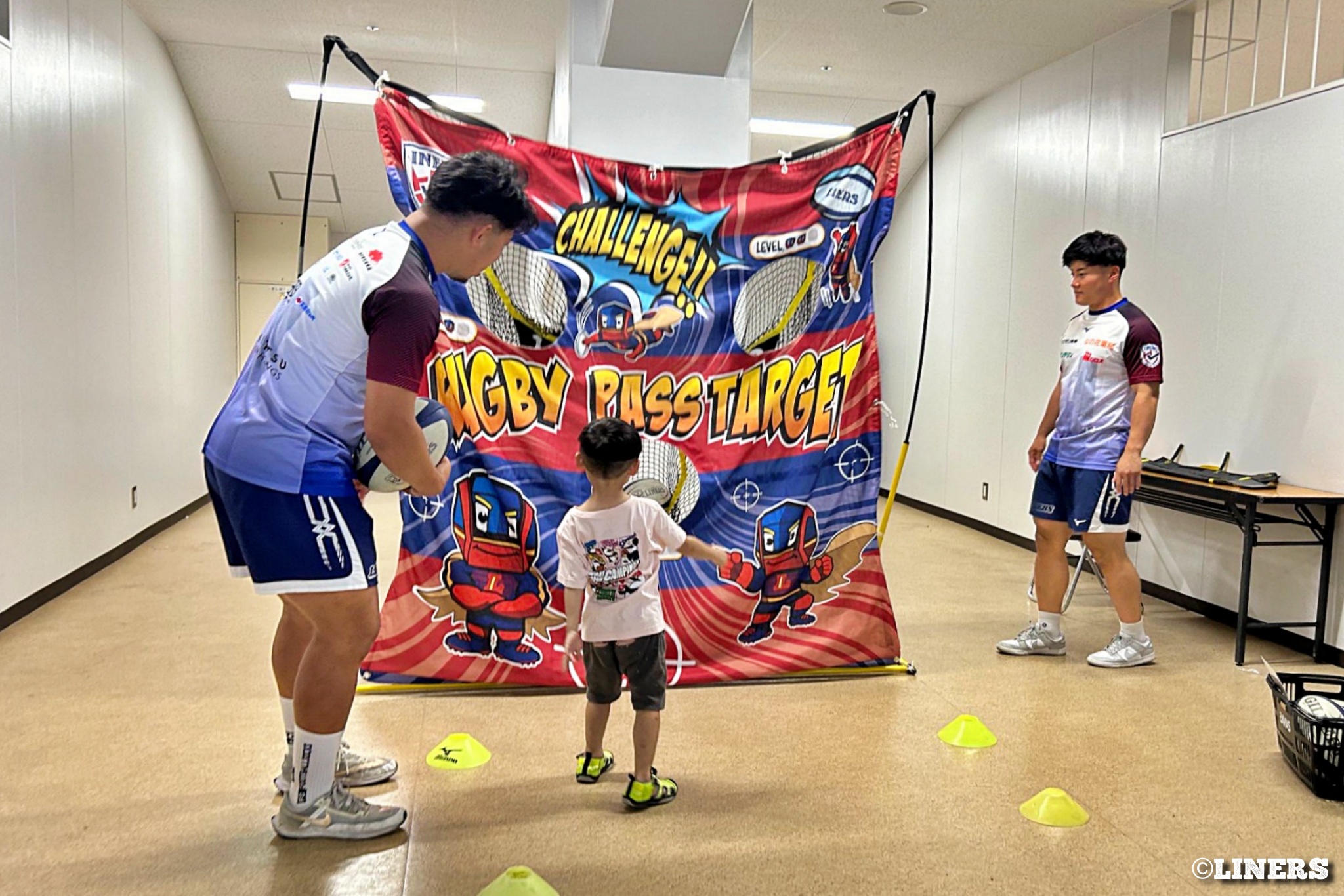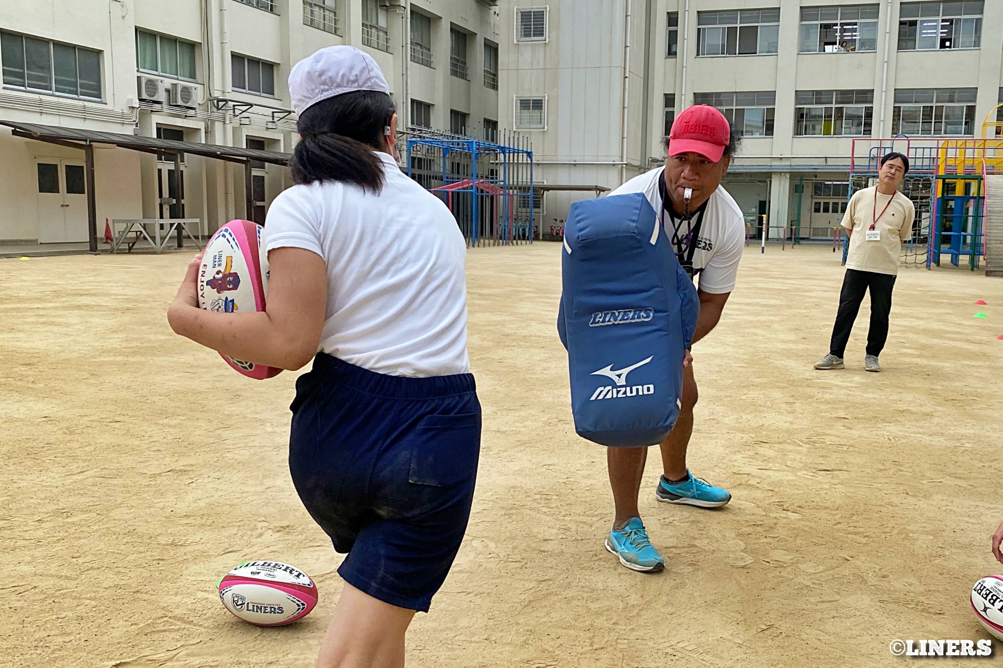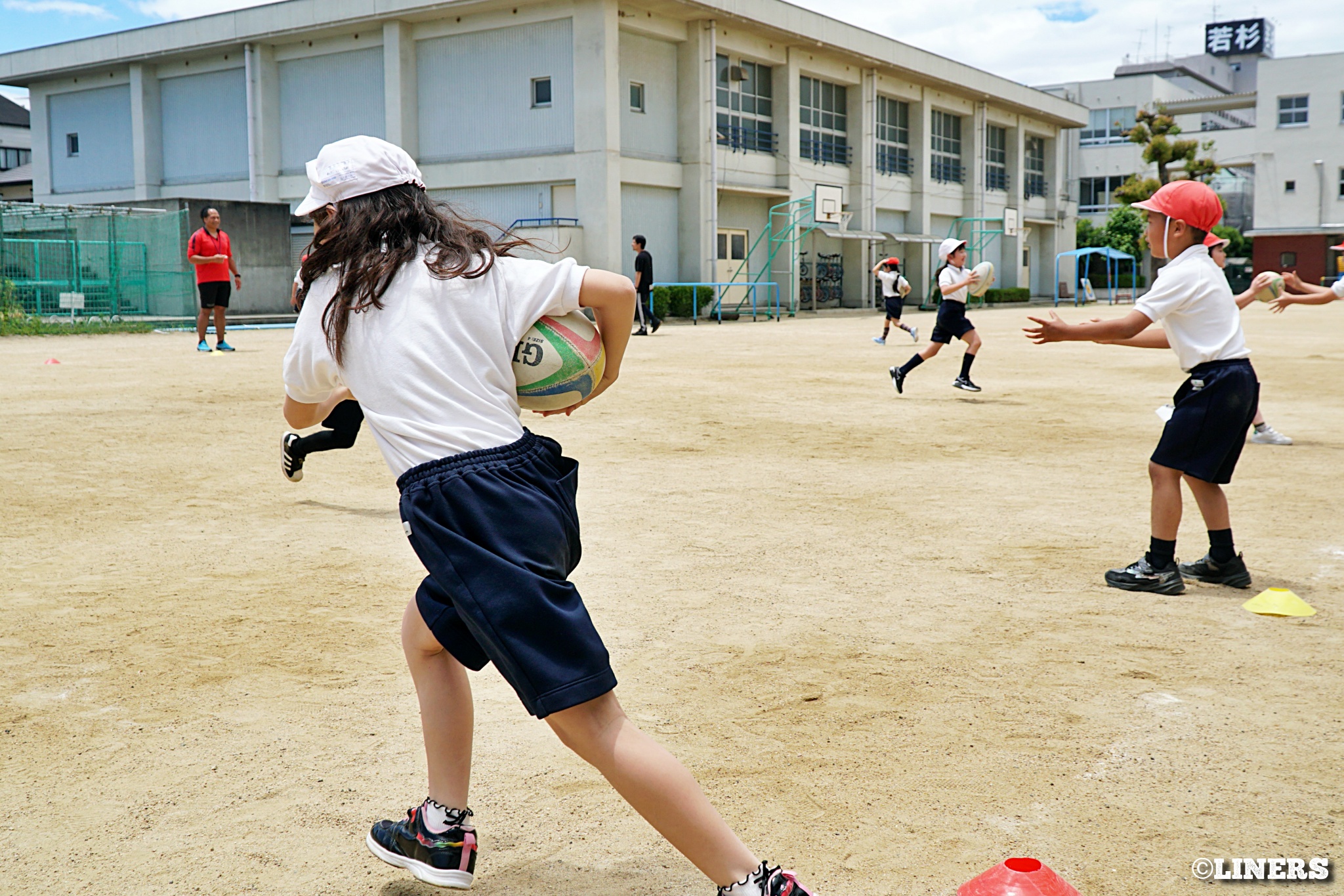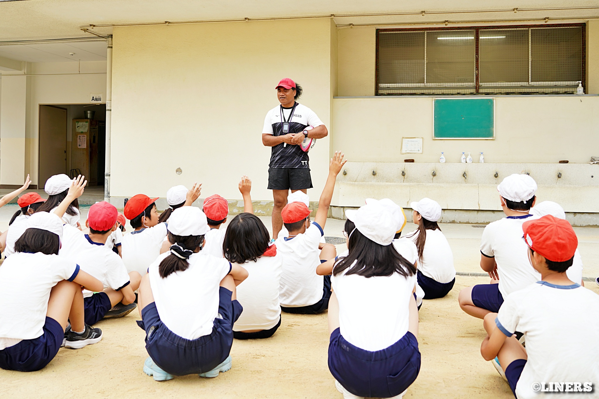 茨田南小学校の6年生にラグビー体験を行いました。この日から普及活動用のラグビーボールを新調。ライナーズのマスコットキャラクター「ライナマン」とSNS広報担当の「ラビナーくん」があしらわれたボールです。新品のボールで児童のみなさんもテンションMAX。いつも以上にラグビー体験が盛り上がりました。