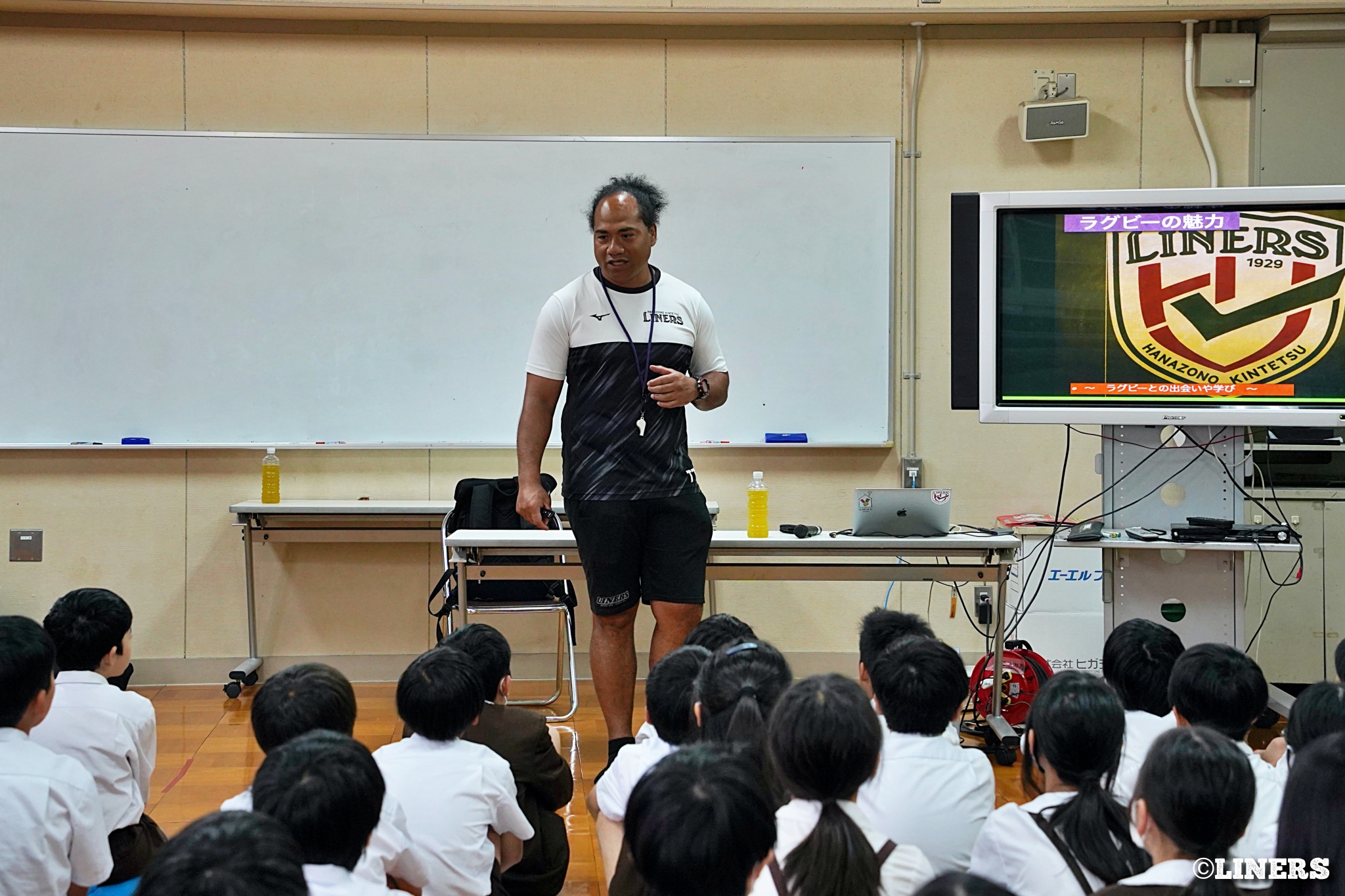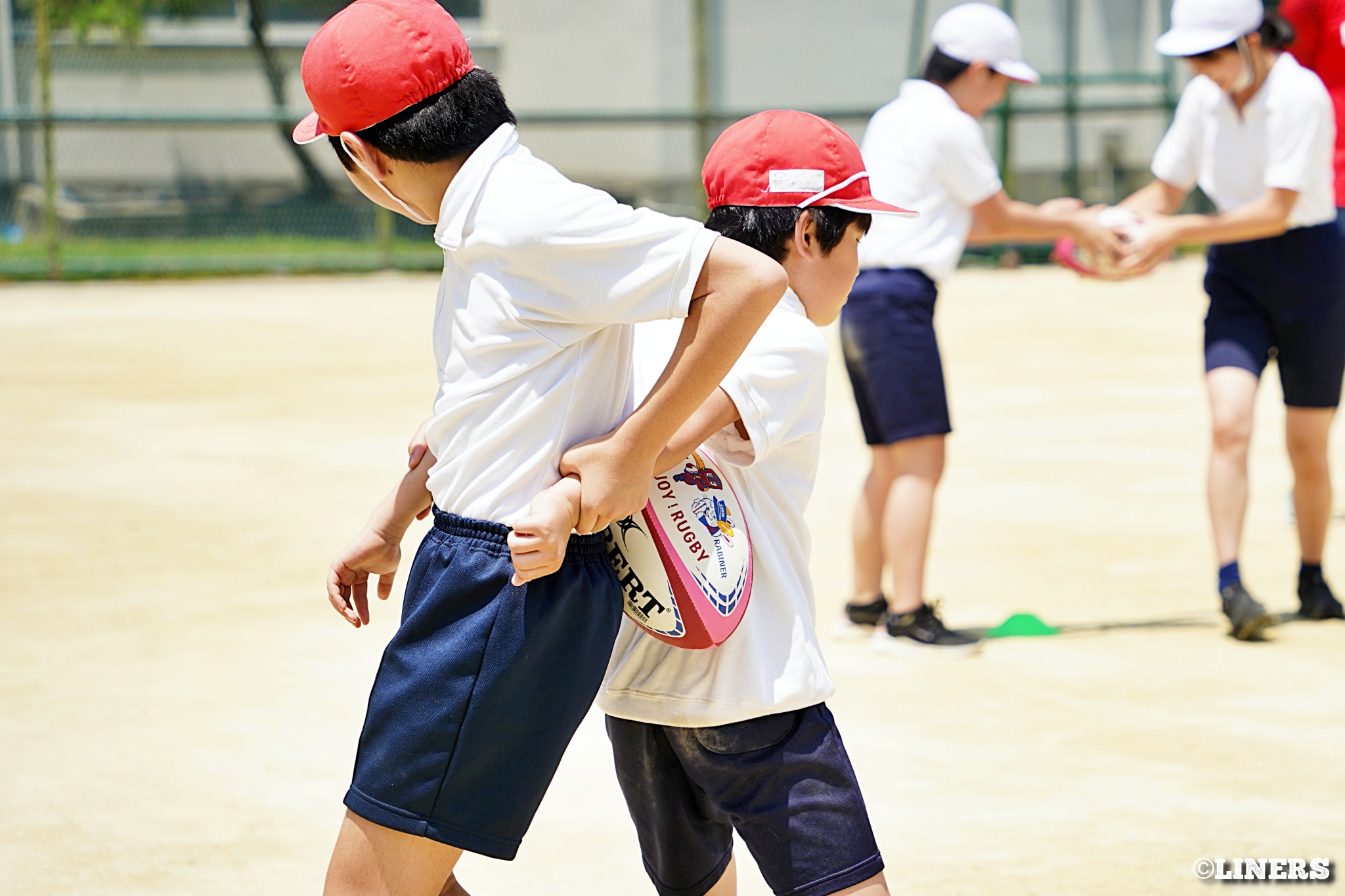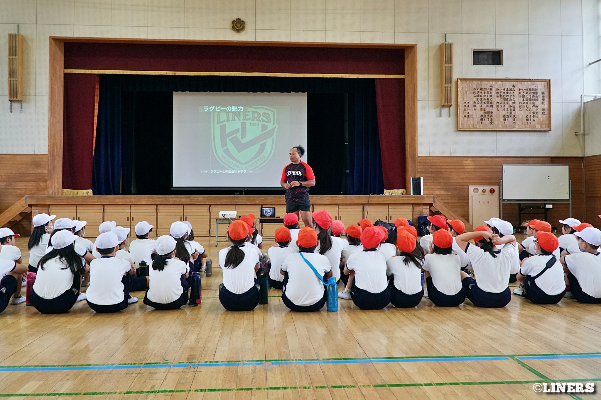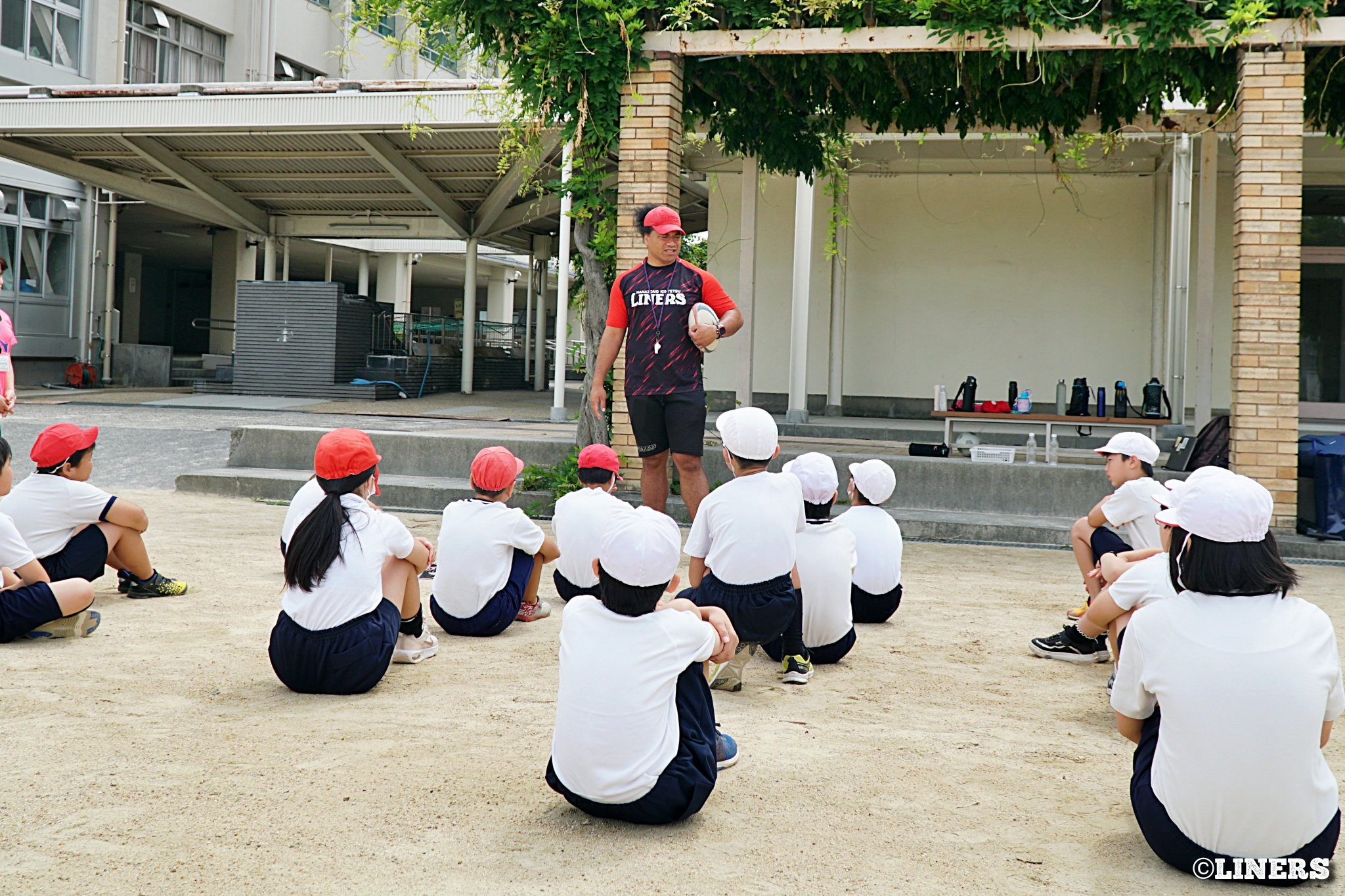 茨田南小学校の6年生にラグビー体験を行いました。この日から普及活動用のラグビーボールを新調。ライナーズのマスコットキャラクター「ライナマン」とSNS広報担当の「ラビナーくん」があしらわれたボールです。新品のボールで児童のみなさんもテンションMAX。いつも以上にラグビー体験が盛り上がりました。