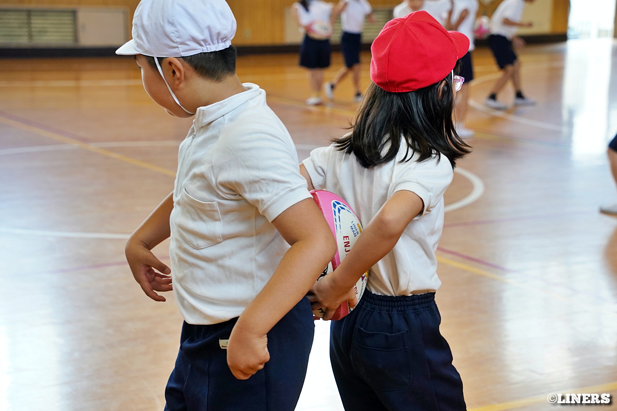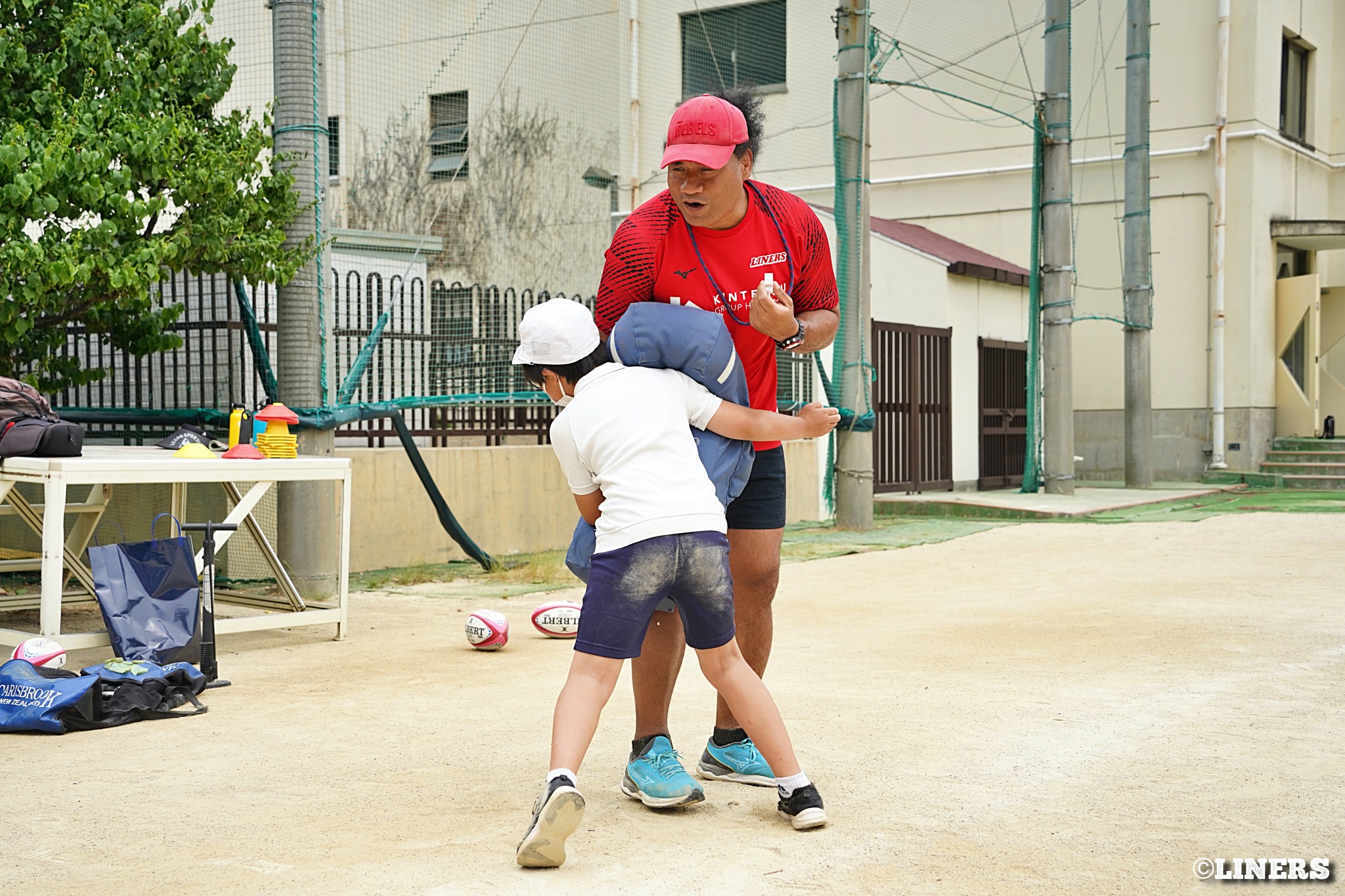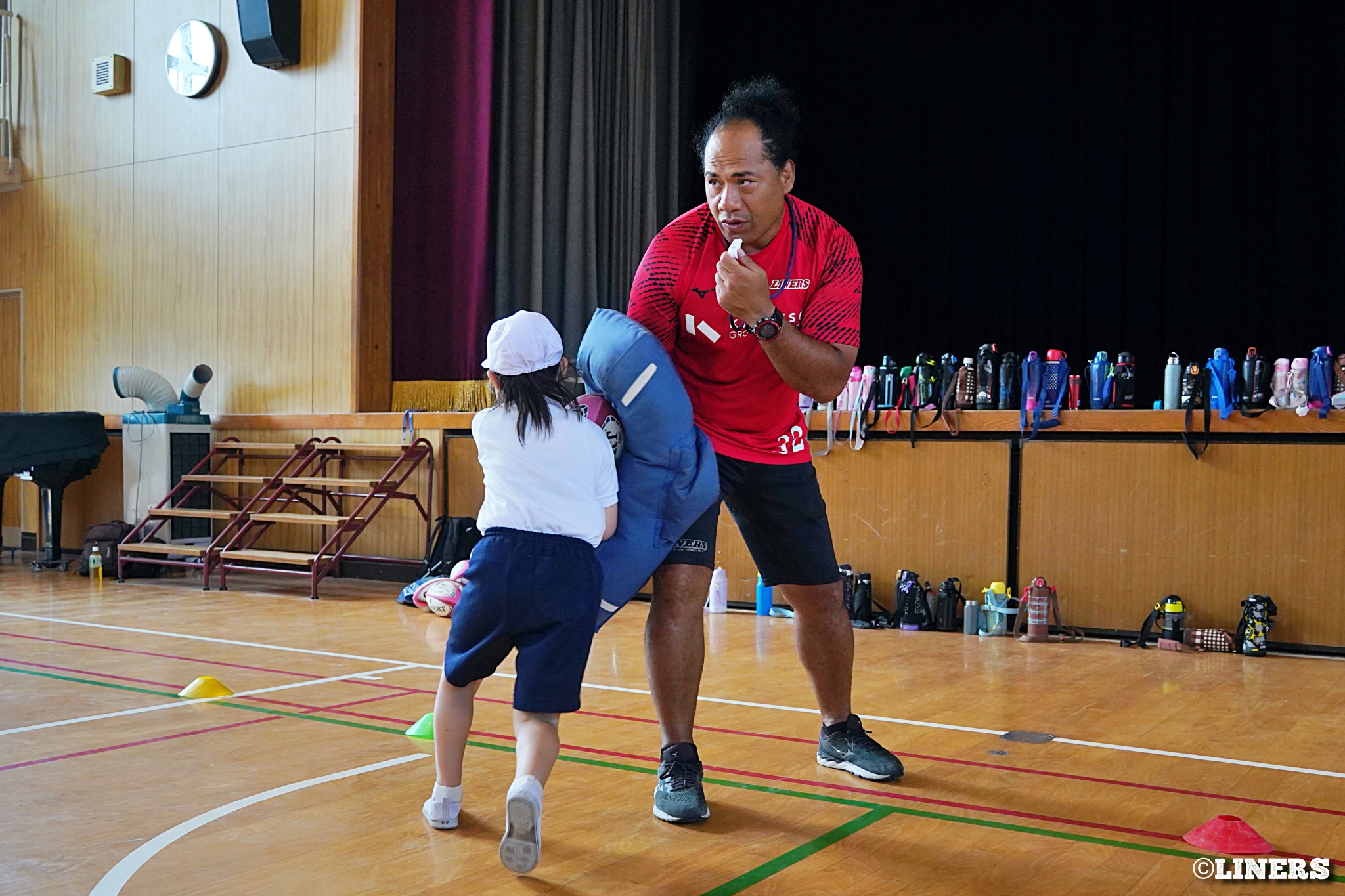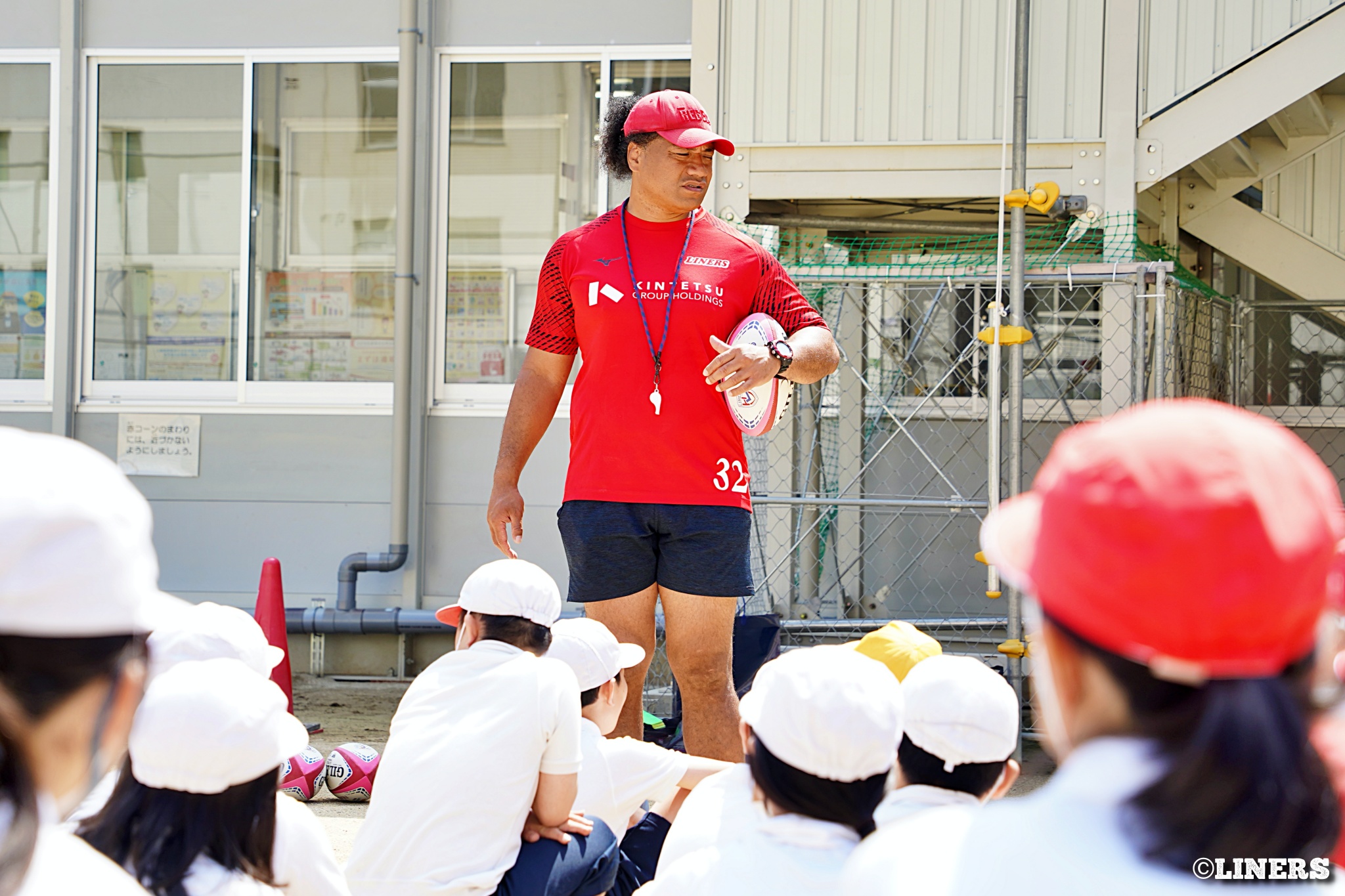 茨田南小学校の6年生にラグビー体験を行いました。この日から普及活動用のラグビーボールを新調。ライナーズのマスコットキャラクター「ライナマン」とSNS広報担当の「ラビナーくん」があしらわれたボールです。新品のボールで児童のみなさんもテンションMAX。いつも以上にラグビー体験が盛り上がりました。