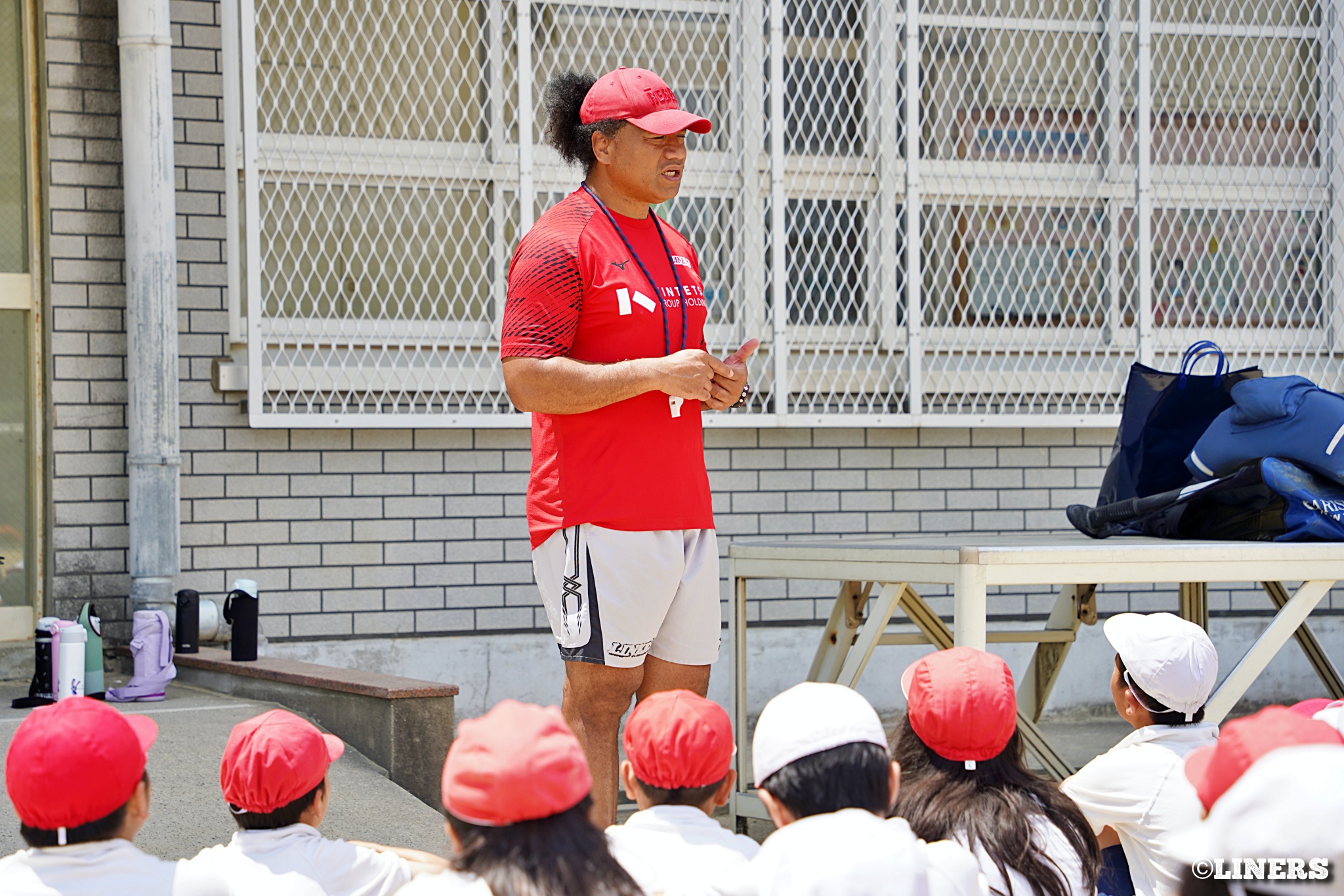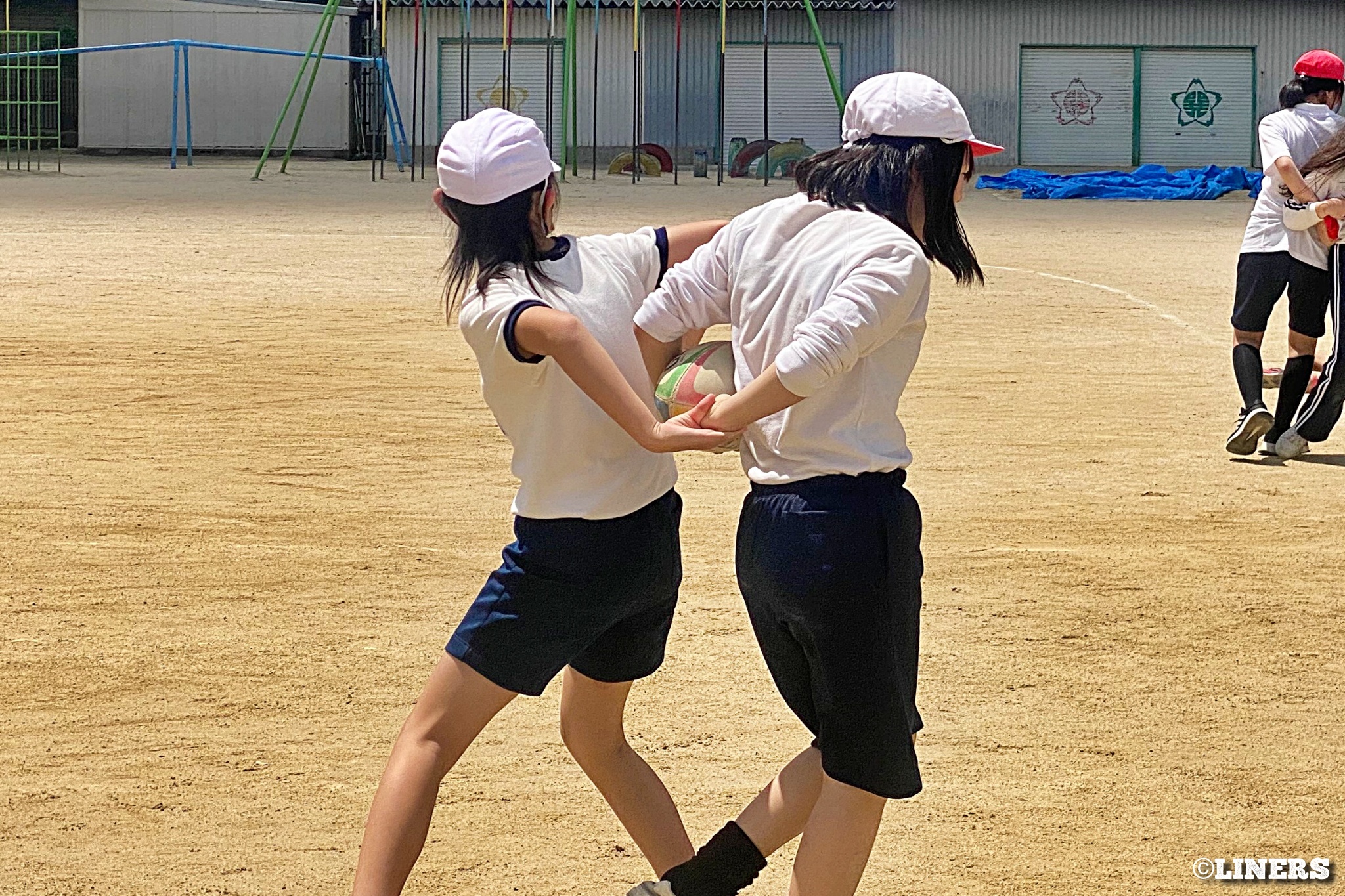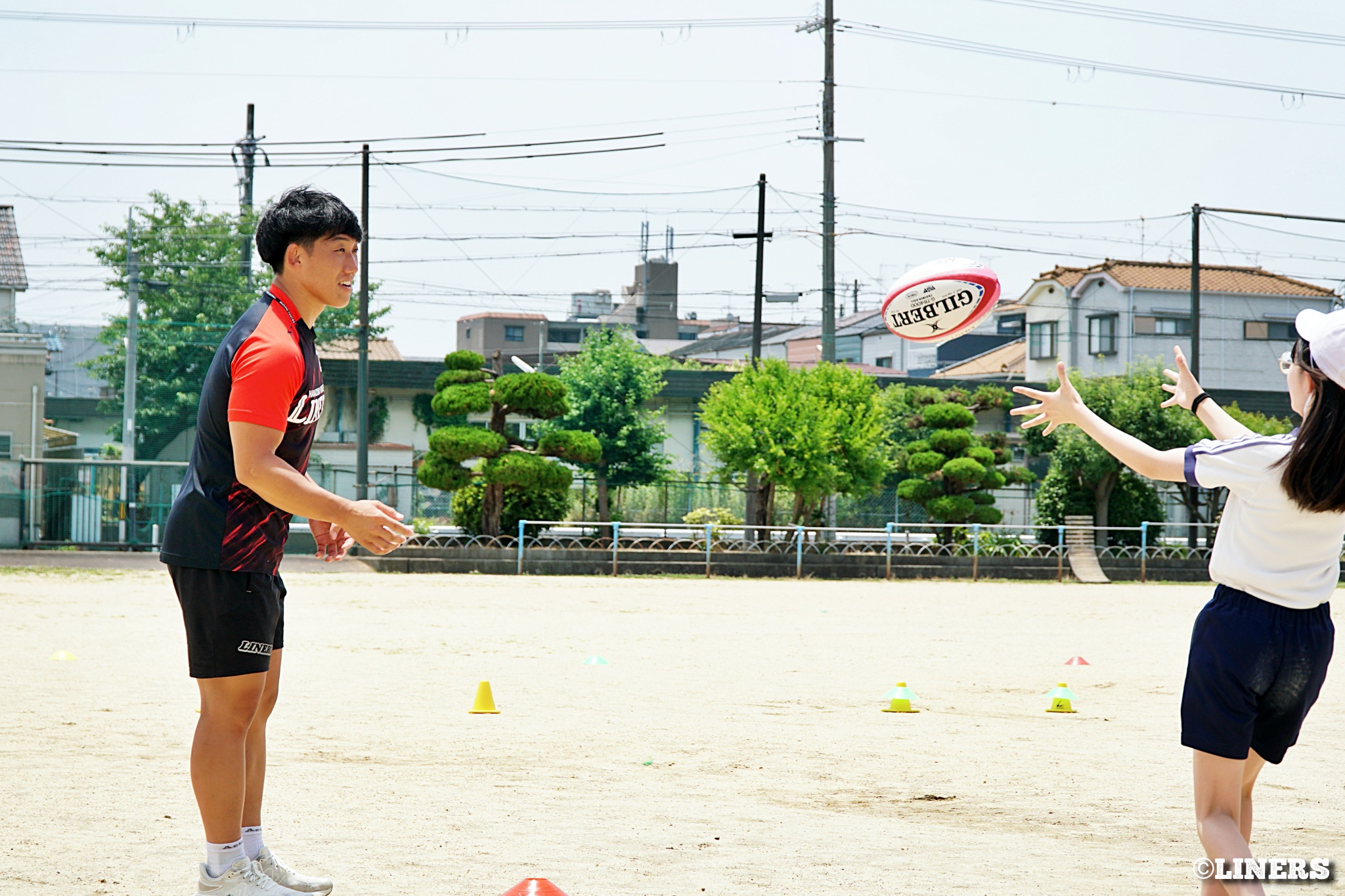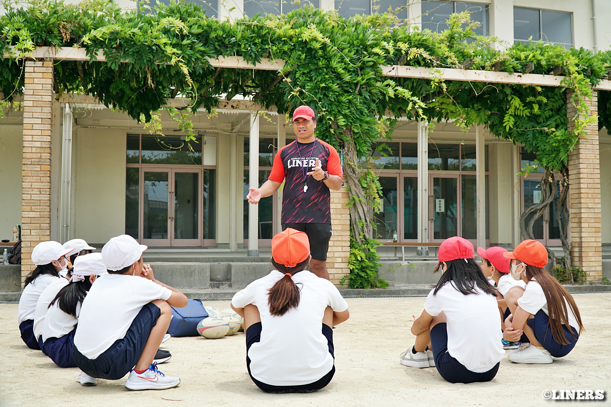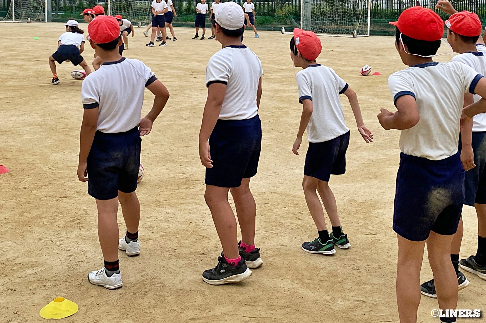 茨田南小学校の6年生にラグビー体験を行いました。この日から普及活動用のラグビーボールを新調。ライナーズのマスコットキャラクター「ライナマン」とSNS広報担当の「ラビナーくん」があしらわれたボールです。新品のボールで児童のみなさんもテンションMAX。いつも以上にラグビー体験が盛り上がりました。