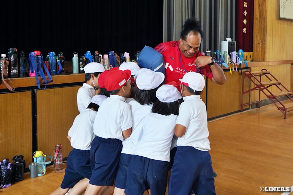 矢田小学校の5・6年生にラグビー体験。体験の前には円陣を組むなど、みんながとても仲の良い学校でした。最後の質問タイムでは、ラグビーのことだけでなくトンガのことなどたくさんの質問をいただきました。