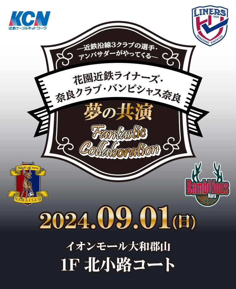 9月1日(日)、イオンモール大和郡山にて開催される「花園近鉄ライナーズ・奈良クラブ・バンビシャス奈良 夢の共演-Fantastic Collaboration-」に参加します。選手も登場しますのでぜひお越しください。