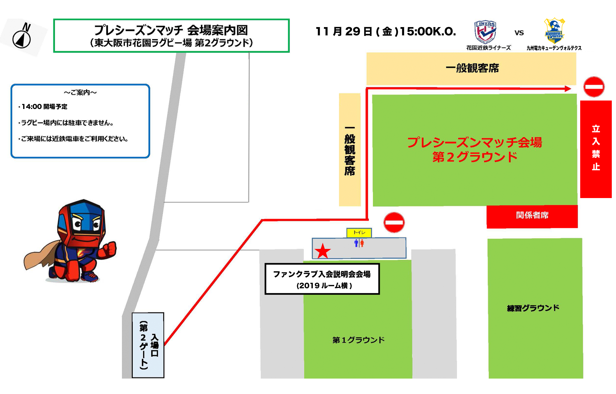 ※12時から特設ブース(ラグビーワールドカップ2019ルーム横)にてLINERS FAN CLUB 2024-25 入会説明会を行いますが、観客席への入場は14時からとなります。入会説明会はキックオフ時間まで随時参加可能です。