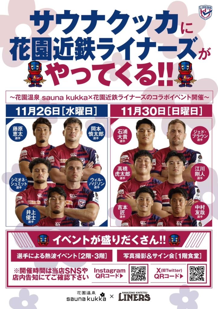 この度、地域経済の活性化や交流人口の拡大につなげる取り組みのひとつとして、東大阪市花園ラグビー場近くの人気温泉施設、花園温泉sauna kukkaの「熱波師」として選手が登場します。