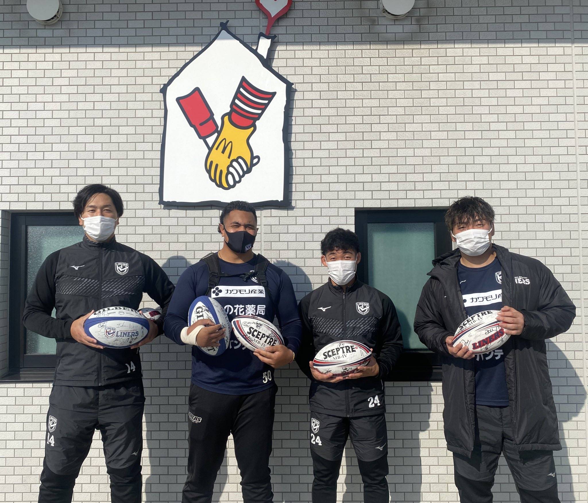 イエレミア・マタエナ選手、人羅奎太郎選手、横井隼選手、村下雅章スタッフの4人と、以前親族がドナルド・マクドナルド・ハウスを利用したことのあるイエレミア選手の妻・ヌアさんも一緒に。