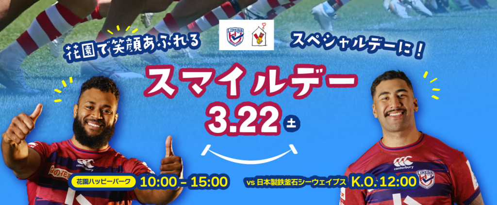 2025年3月22日(土)開催のNTT JAPAN RUGBY LEAGUE ONE 2024-25 第9節 日本製鉄釜石シーウェイブス戦は、「スマイルデー」として開催。ライナーズの選手・スタッフがスマイルソックスにちなんだソックスを履いて試合に臨みます。