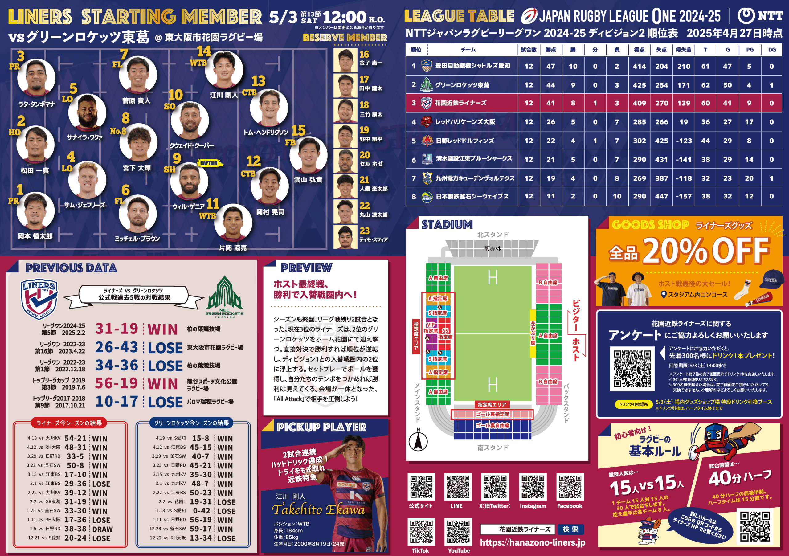 5月3日(土)開催のNTTジャパンラグビー リーグワン2024-25 Div.2 第13節【なの花薬局マッチデー】