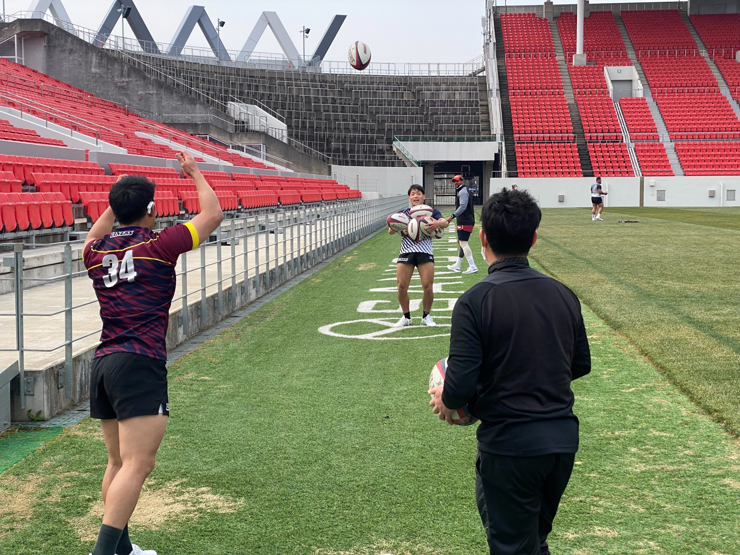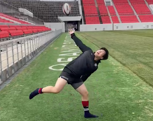 ラグビーボールを何球キャッチできるか限界にペアで挑戦!1人はパスを投げて、もう1人がキャッチ。ボールを持ったままの状態で何球キャッチできるか記録に挑戦しよう。