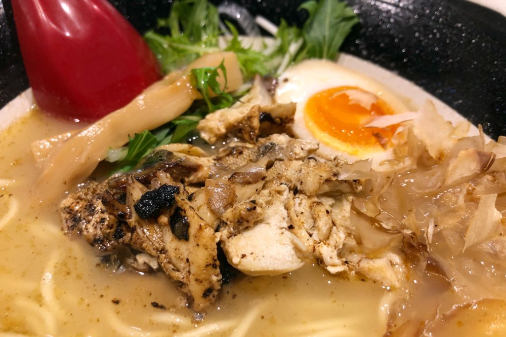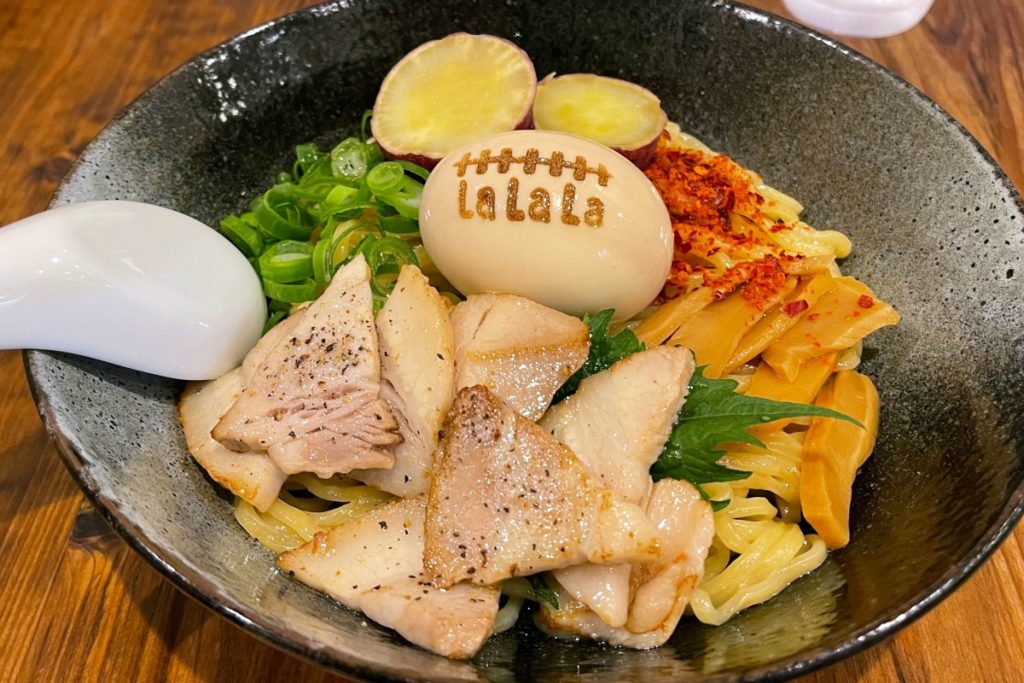 優しい煮干しスープと、国産小麦100%自家製麺のラーメン。味玉子にはラグビーボールの焼印が。7周年を迎え、ますますパワーアップ。