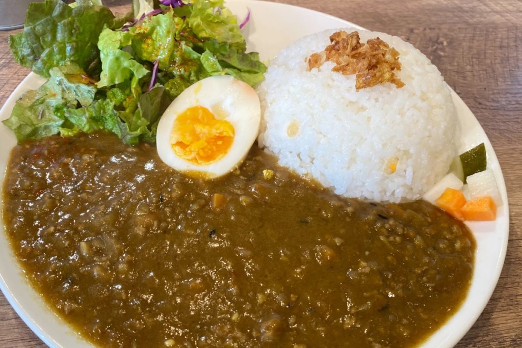 スパイシーチキンカレーに、くんたまキーマカレーが名物のカフェ&カレーショップ。