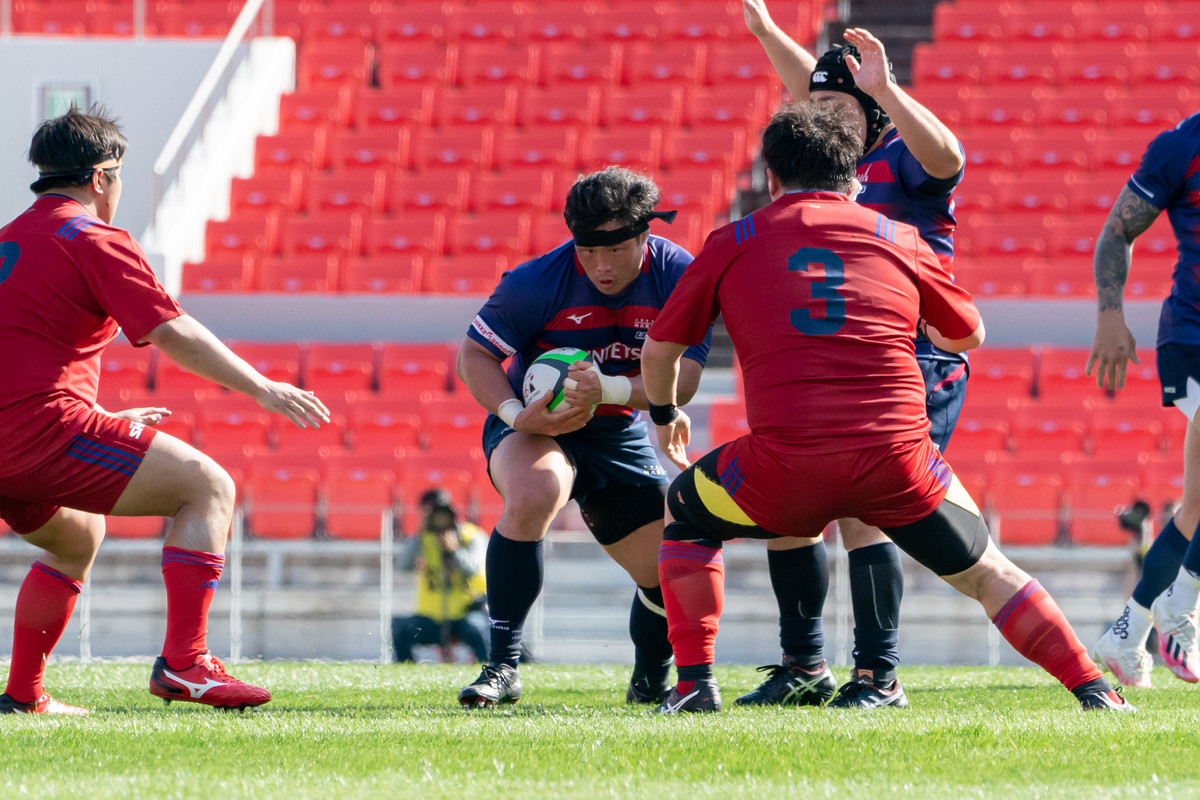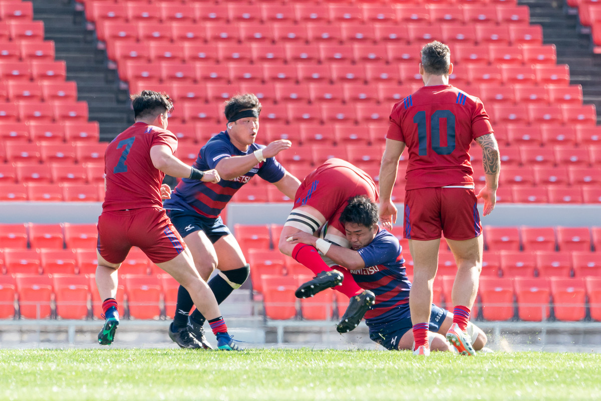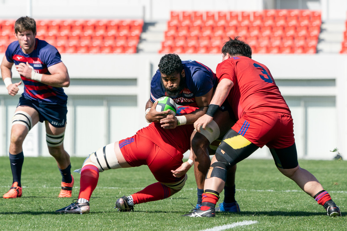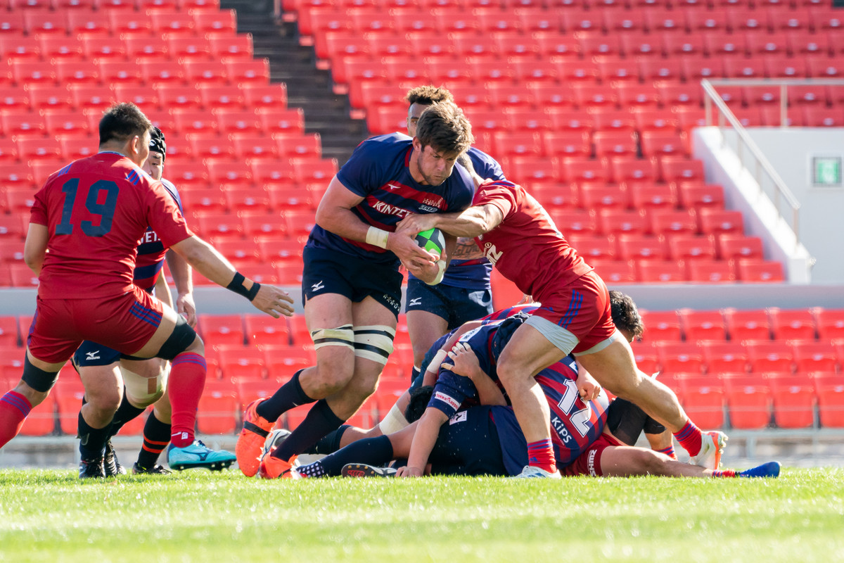 清水建設の激しいモールを前にディフェンスを崩されるライナーズ。