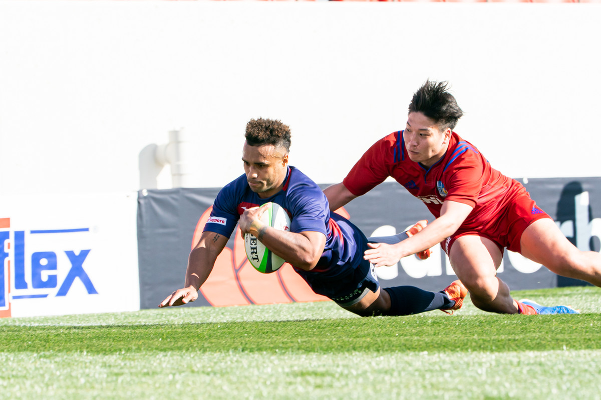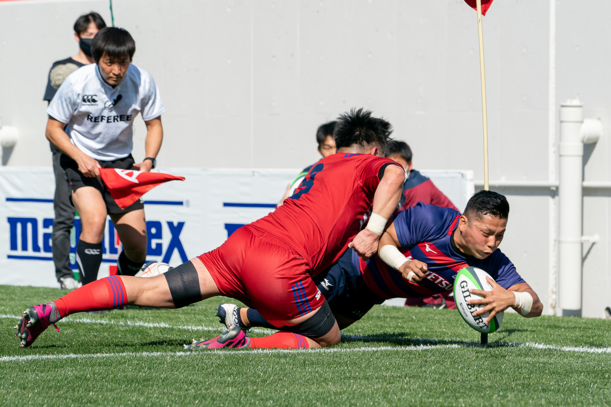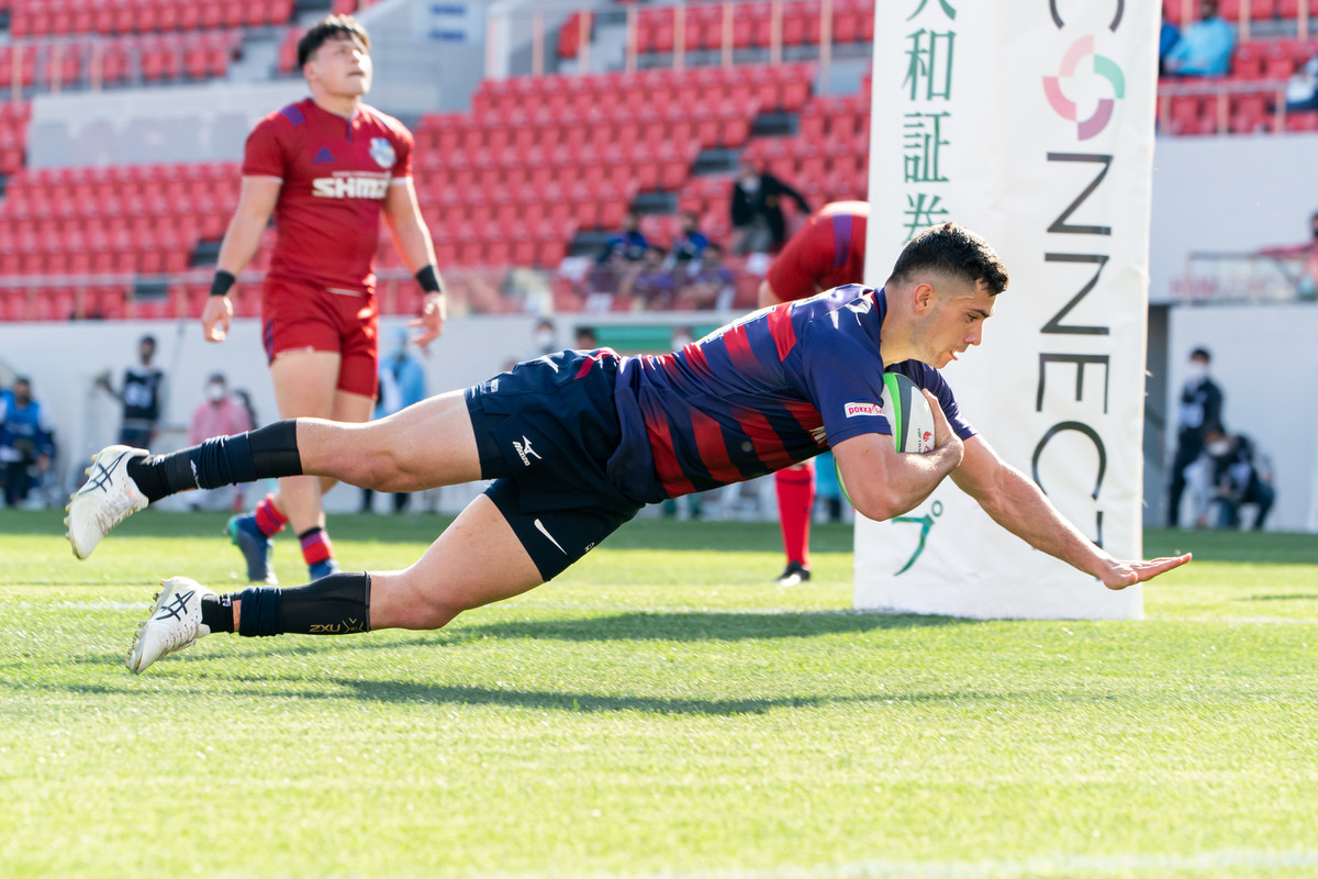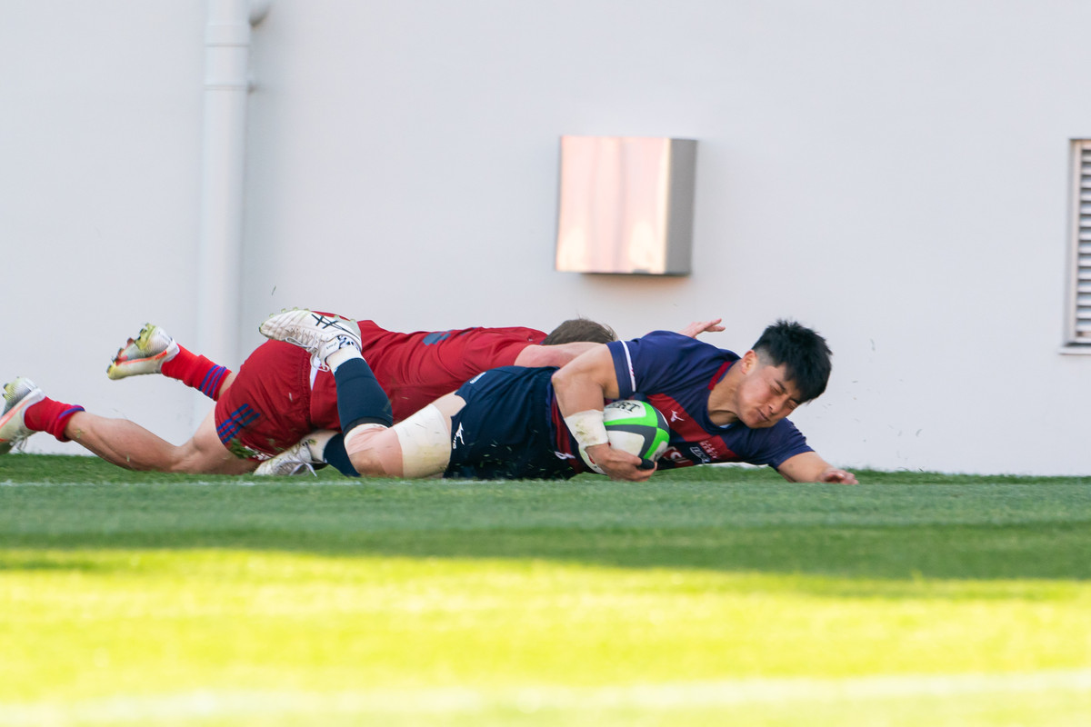 6分に片岡が2本目のトライ、14分にはタックルで相手がこぼしたボールをステイリンが素早く抑えトライ。