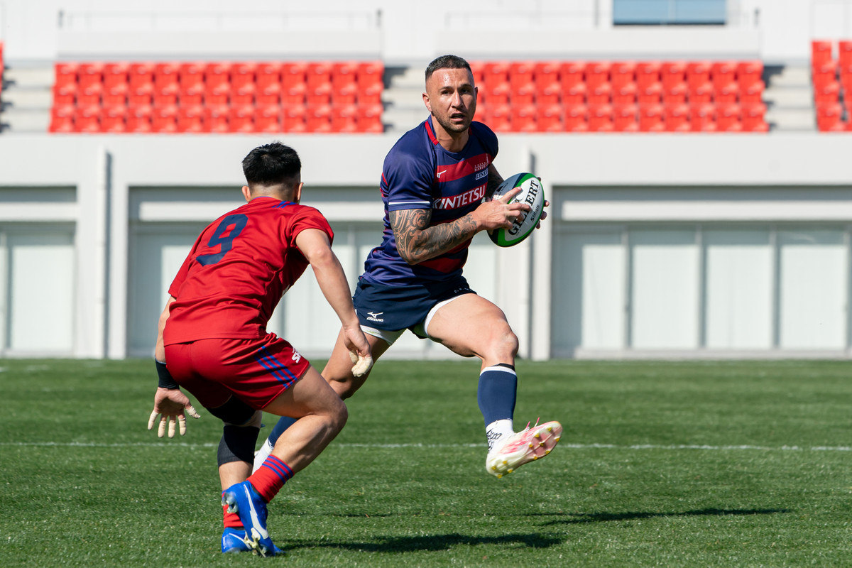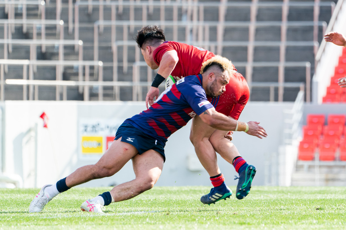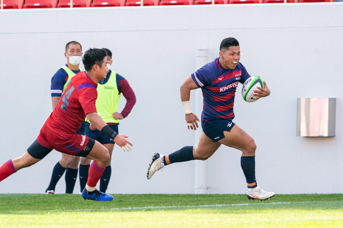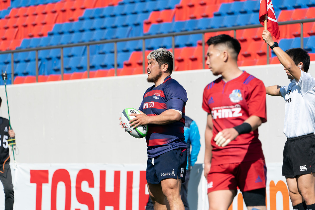 グラウンドをワイドに使ってボールを回すライナーズは、前半3分12ステイリンが22m付近で相手ディフェンスを抜けると13パスカルへ渡り、先制トライ。切れ味の鋭いランでスタートを切ります。