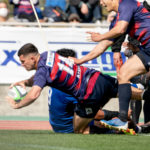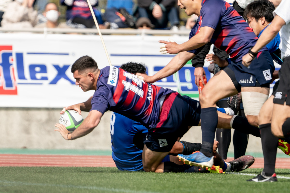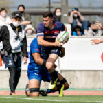 なんとか挽回したいライナーズは、フェーズを重ねて少しずつ前進。前半39分、密集から右に回して、14ジョシュアがトライをあげます。