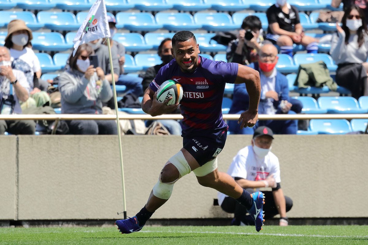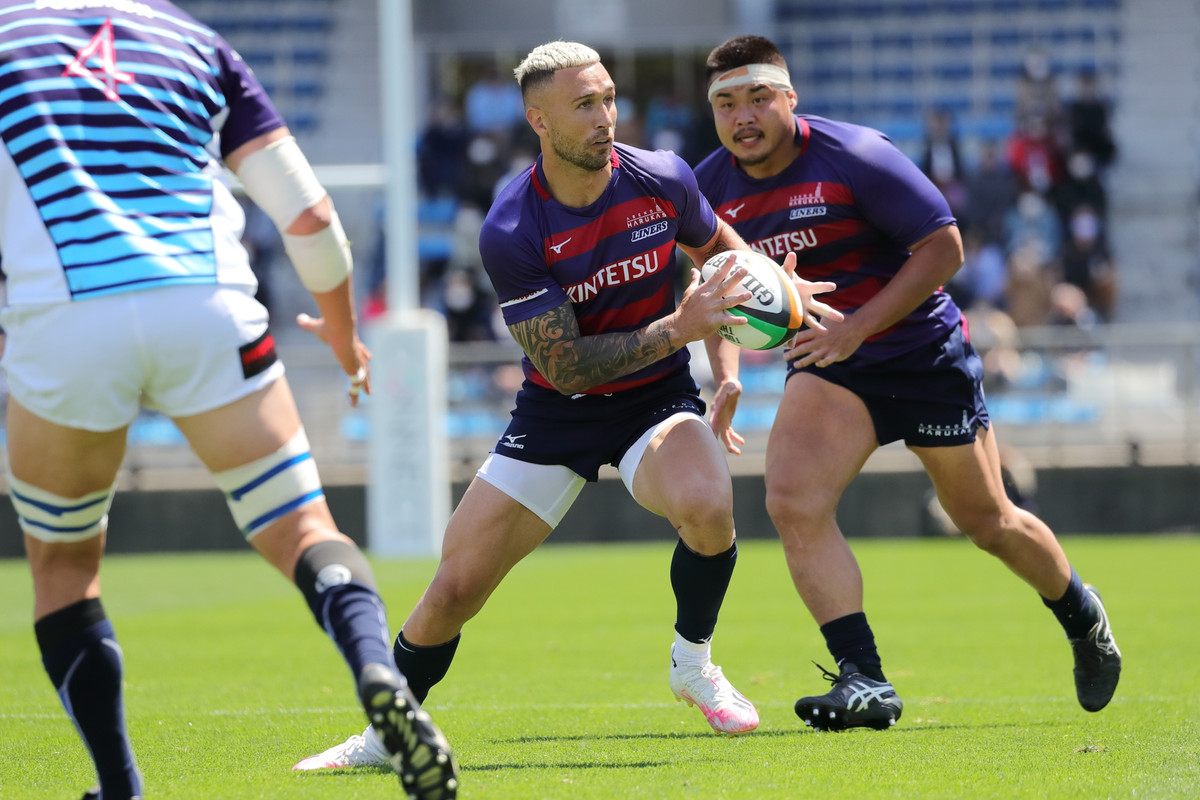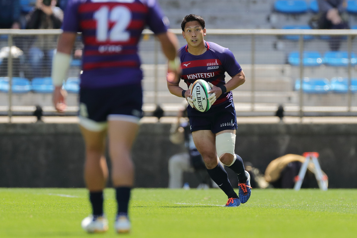 その後も、14人で少しずつ1人分をカバーし敵陣でプレー。29分、自陣ゴールラインを背にしたディフェンスで粘れずトライを献上し24−21と詰め寄られますが、直後の33分に今季のライナーズらしい形が出ます。