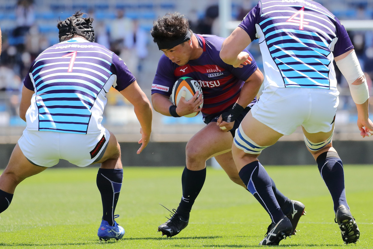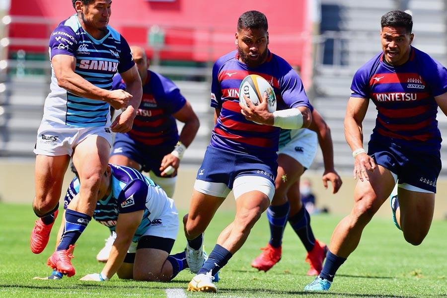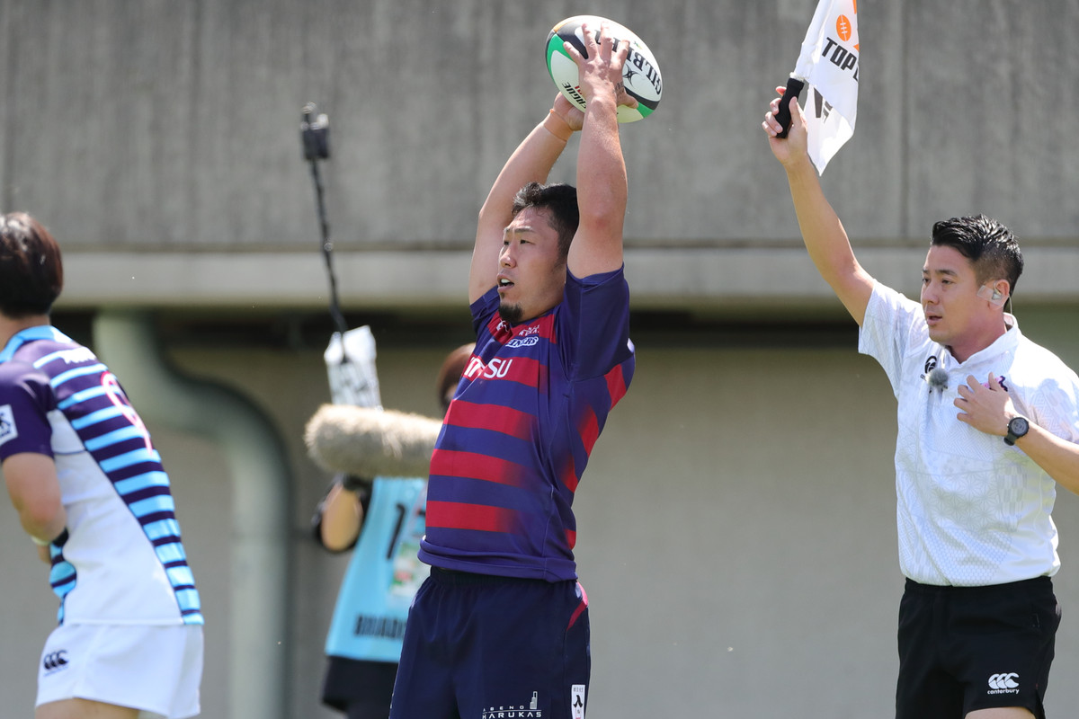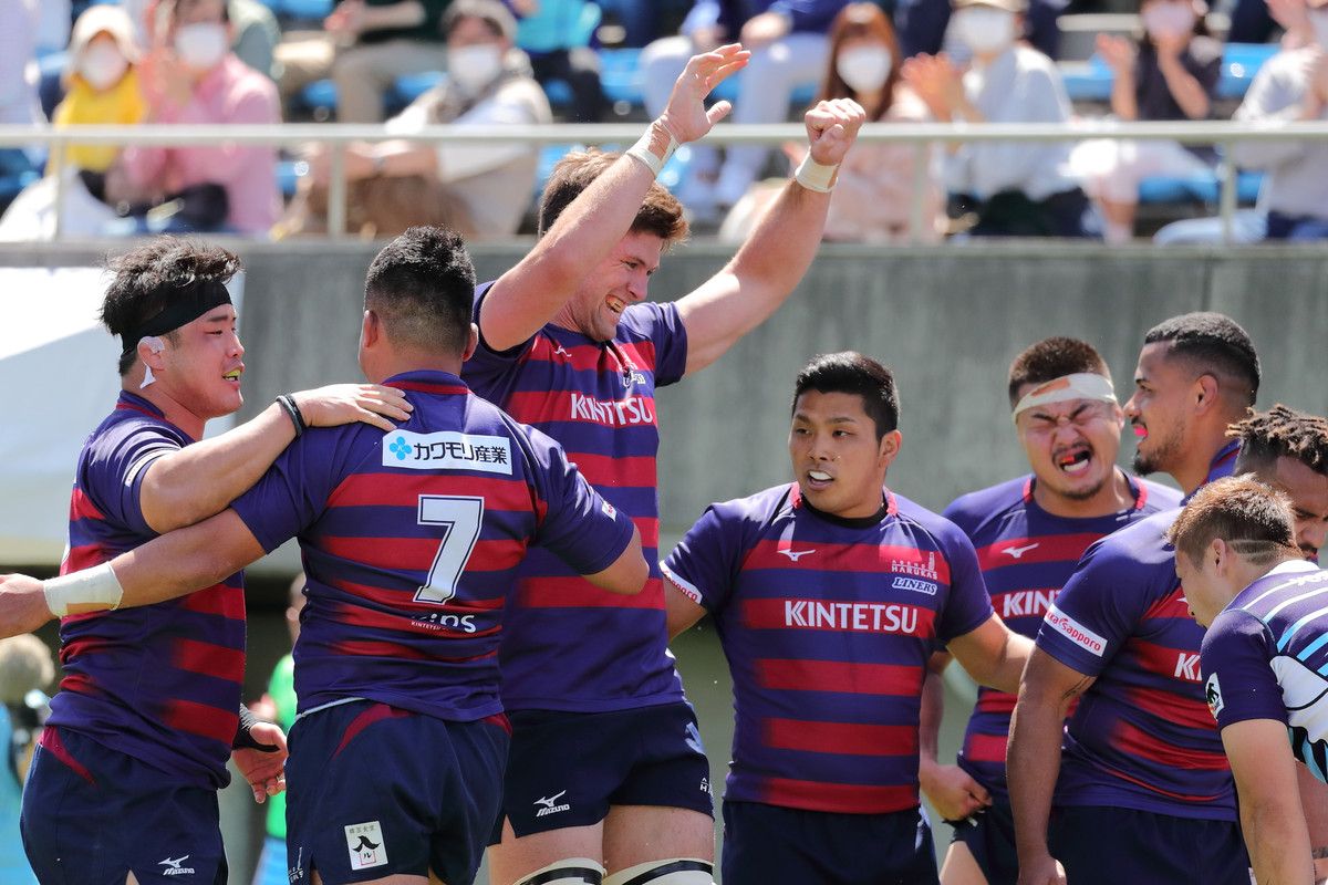その後も、14人で少しずつ1人分をカバーし敵陣でプレー。29分、自陣ゴールラインを背にしたディフェンスで粘れずトライを献上し24−21と詰め寄られますが、直後の33分に今季のライナーズらしい形が出ます。