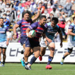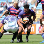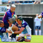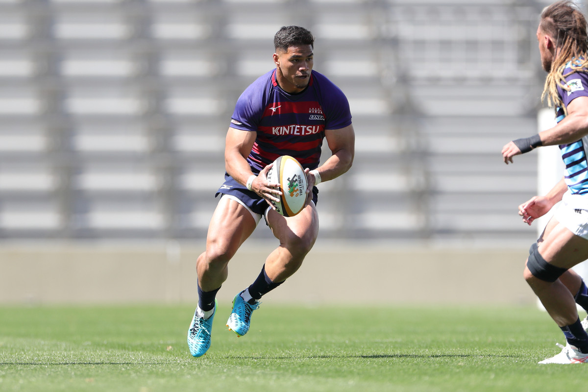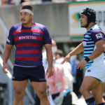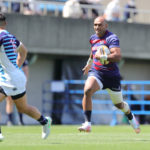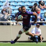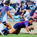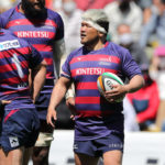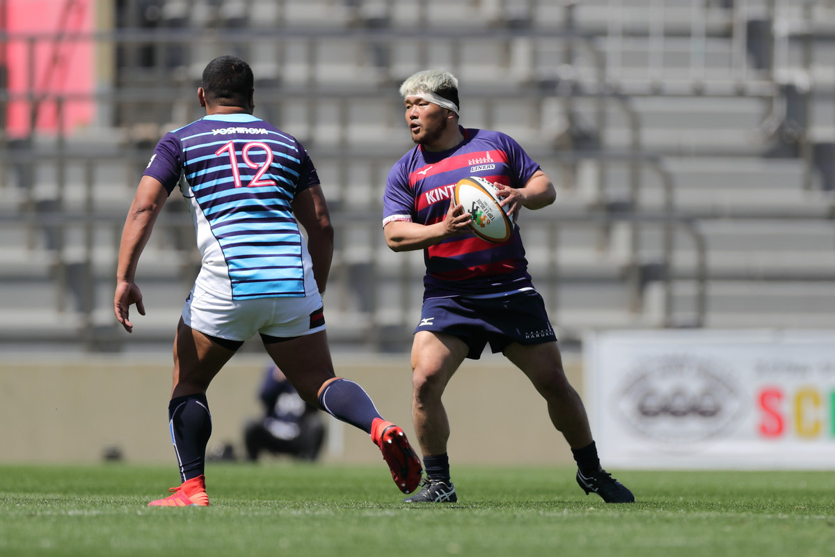 18分、ライナーズの形が見えます。敵陣に攻め込み、SOクーパーの動きでサニックスディフェンスを左中央に集めると、SHゲニアからCTBフィフィタ、さらにFB竹田が前進して最後はオフロードでFLツポウにパス。追撃を開始を告げるトライを奪い、5−7とします。