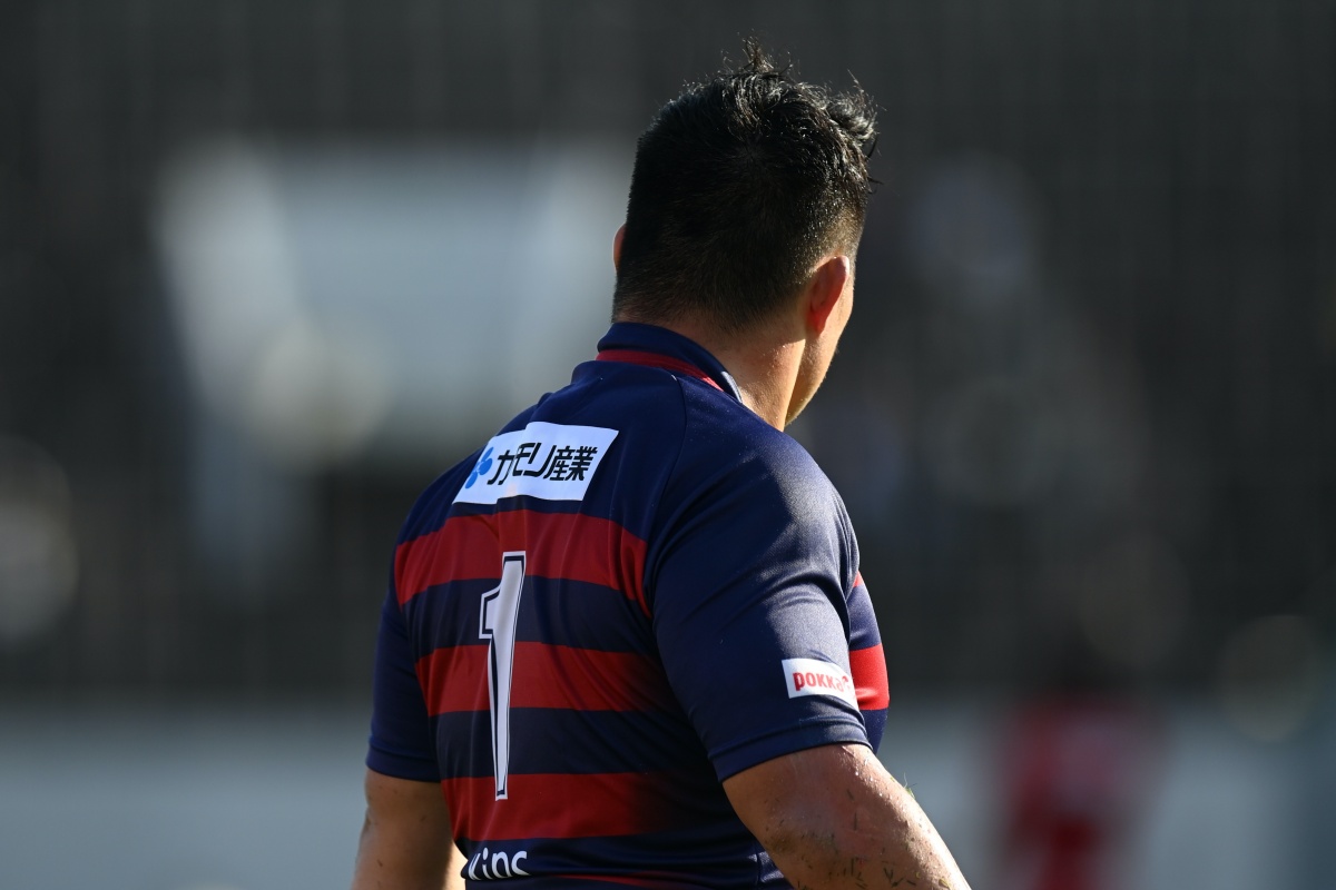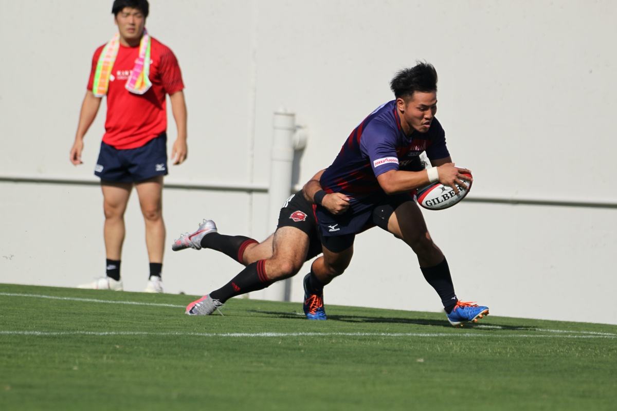 さらに1トライを決められ、12-33で迎えた後半33分。ドコモのペナルティで相手陣22m内に入ると、マイボールスクラムから押し勝ち21人羅が後ろから走ってきた12岡村へパス。相手ディフェンスを引きずりながらトライをねじ込みます。10吉本のゴールも成功し、19-33。