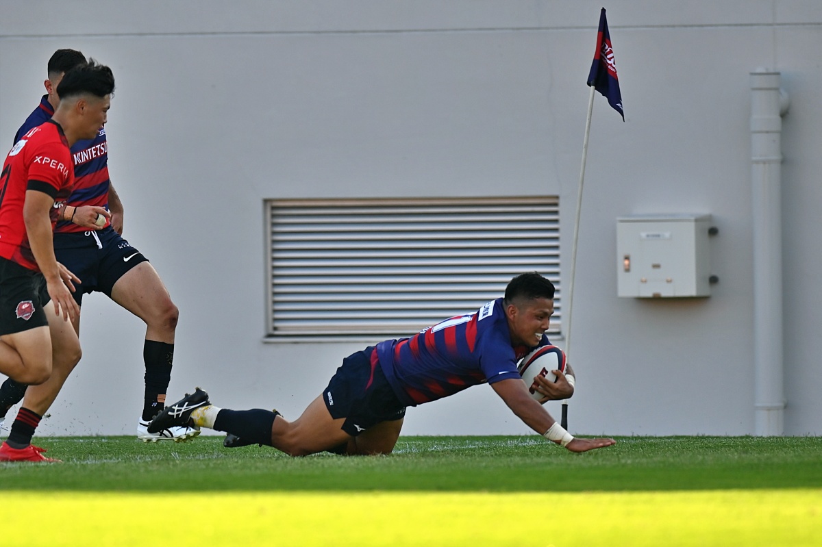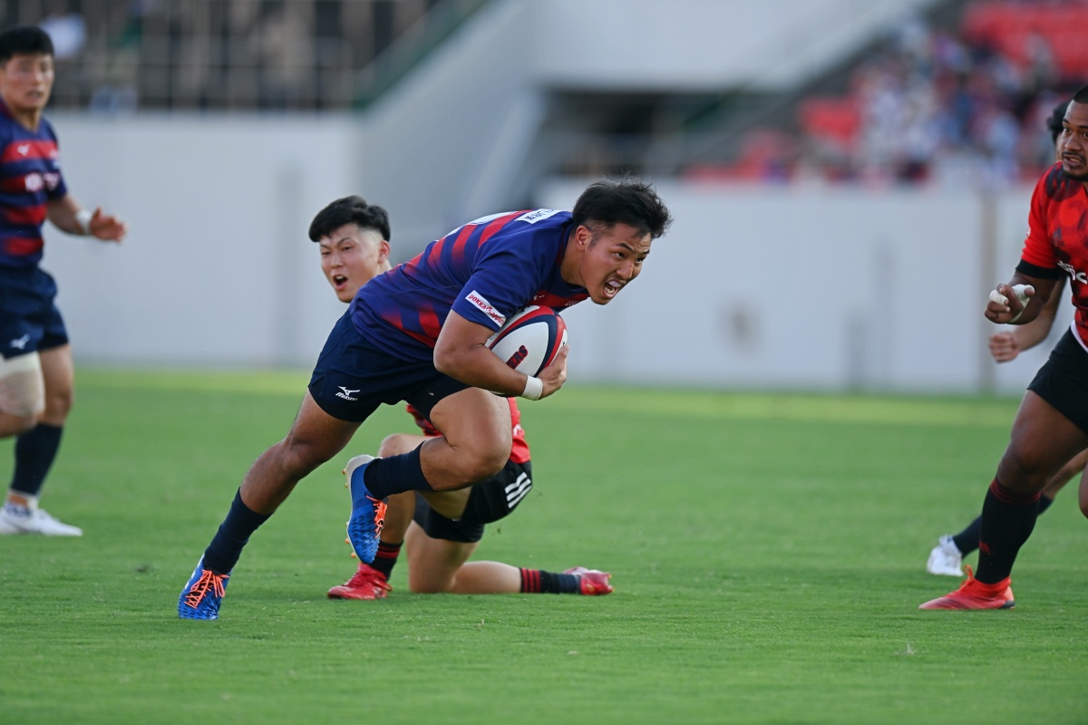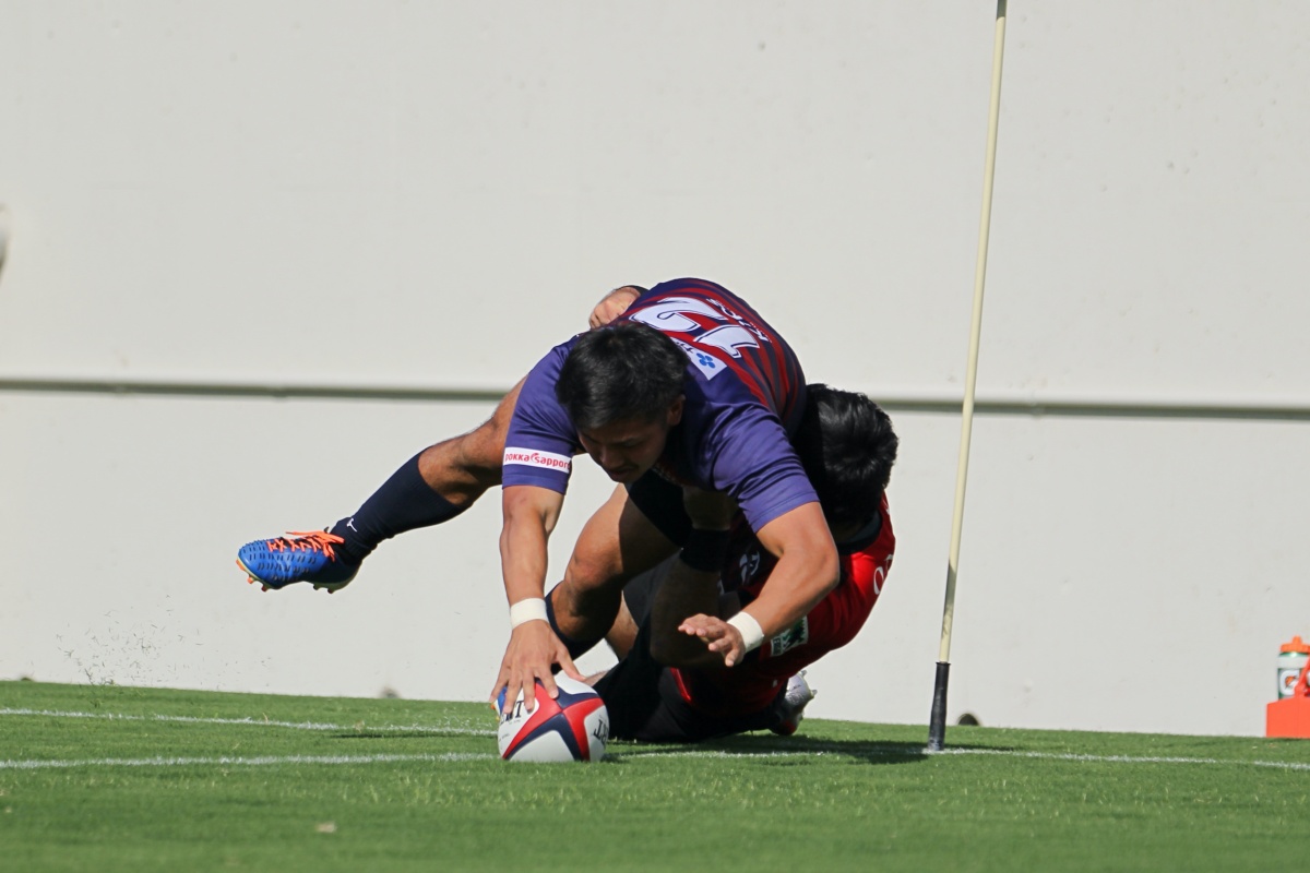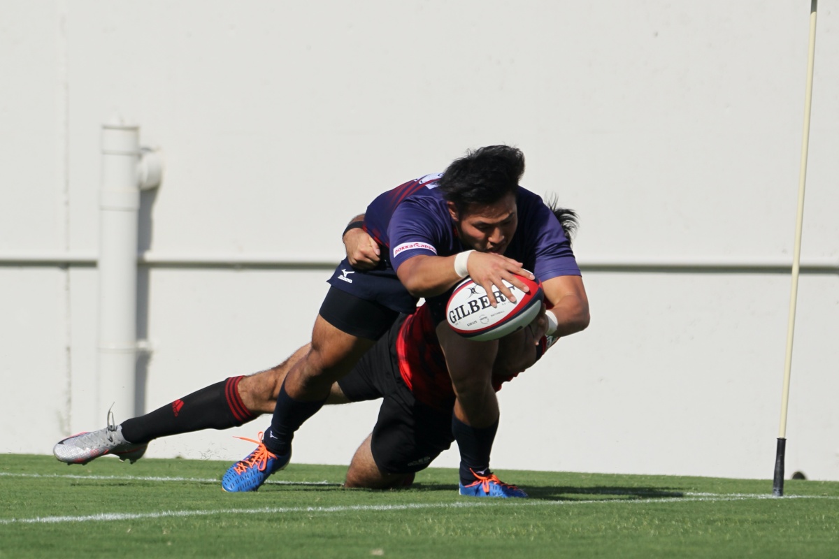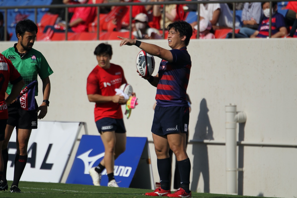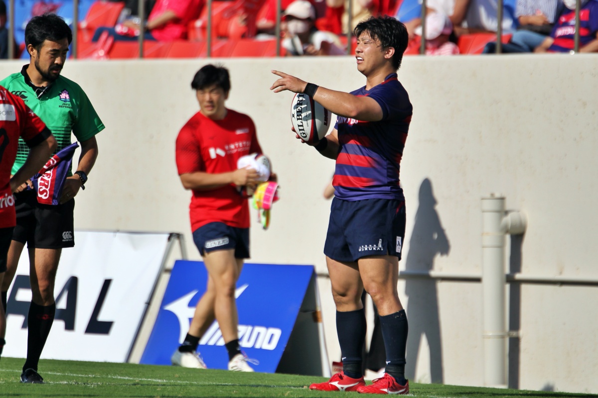 5-7のNTTドコモリードで迎えた18分、ラックから10吉本が後ろから走ってきた15野口へつなぎ、そのまま中央右にトライ。