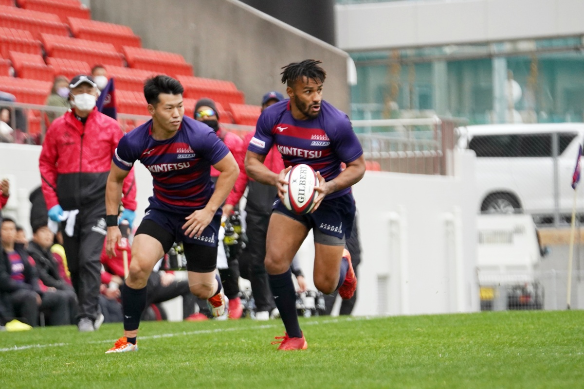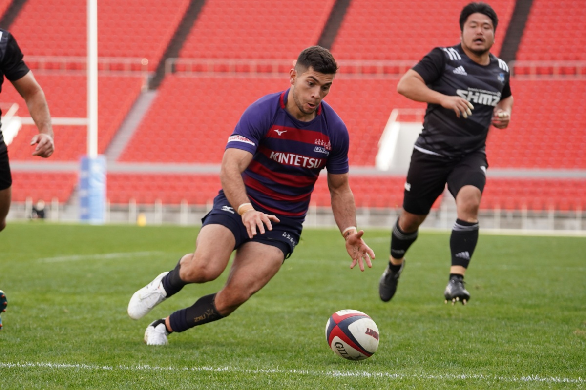| 22m手前ターンオーバーからつなぎ11ジョシュアが キックし追いかけ自ら左サイドにトライ |