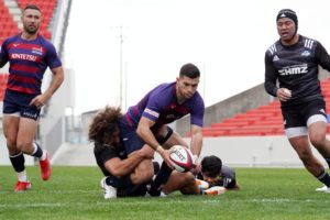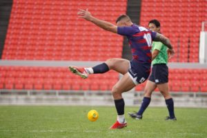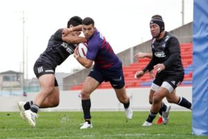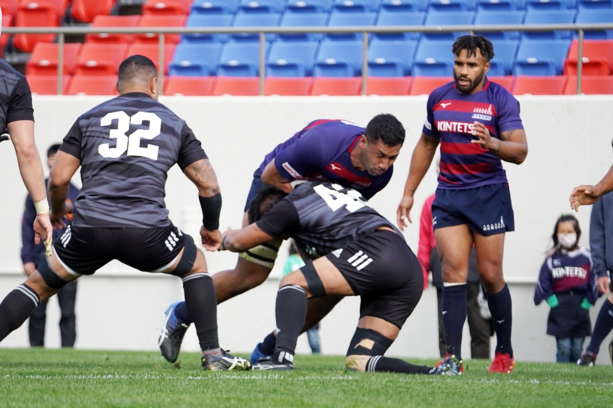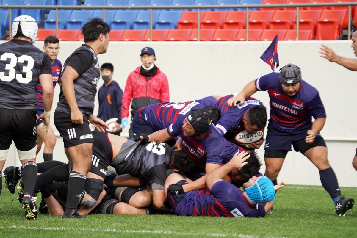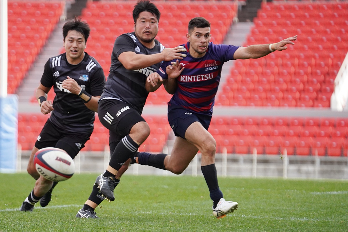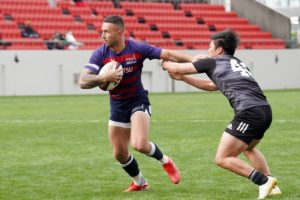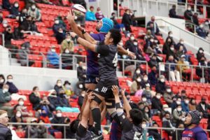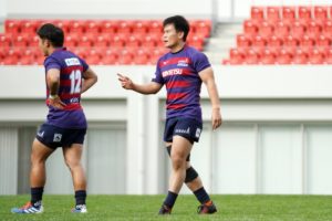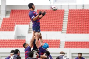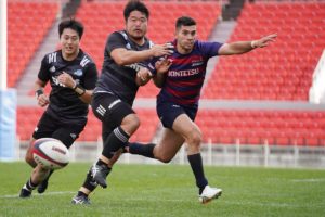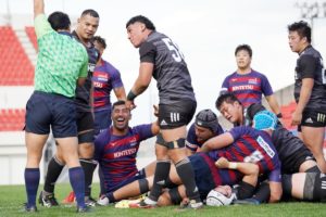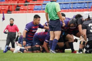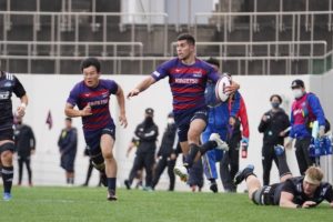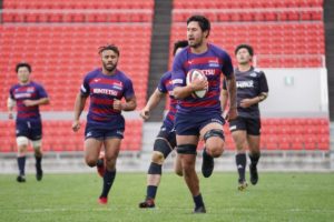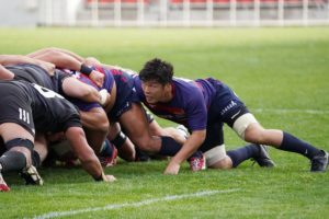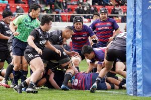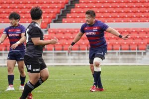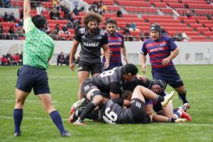 前半3分、ゴール前5m右サイドで10クーパー、12岡村、15野口と危なげなく繋いで中央にトライを決め、好調な出だしに。