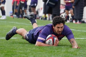 ライナーズ陣22mでのキックをチャージし 8ラトゥイラがそのまま左ポール横にトライ |