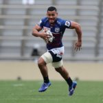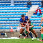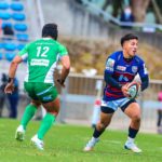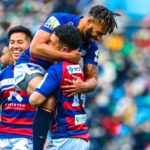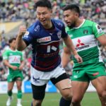 自陣から9ゲニアがキックし、ダイナボアーズが応戦すると10クーパーがキャッチ。自らキャリーし14南藤、クーパーで交互にパスをし合い、最後はゲニアに渡って中央右にトライを決めます。クーパーのゴールキックも成功し、7-17。