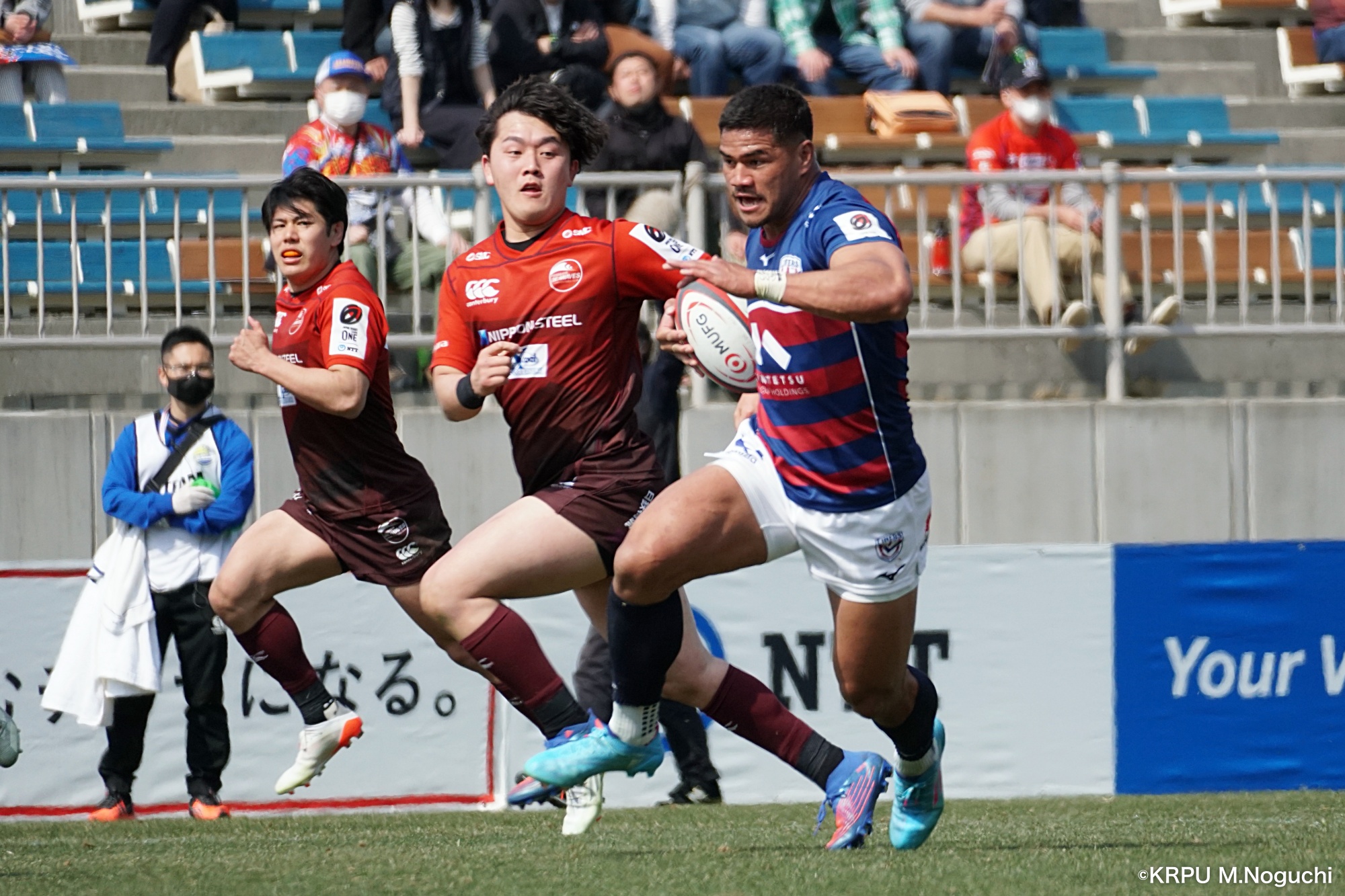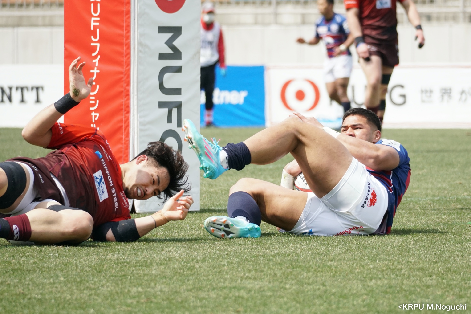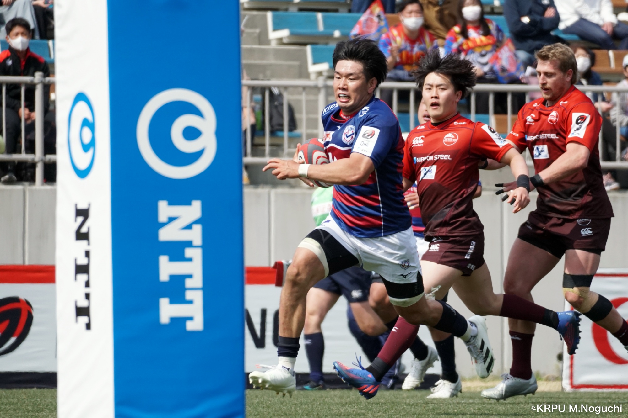 前半39分、林がグラバーキックで前に進めると、拾った9人羅がゲイン。後ろから追ってきた林にもう一度渡ると、トライを決めます。12ステイリンのゴールも成功し46-0に。