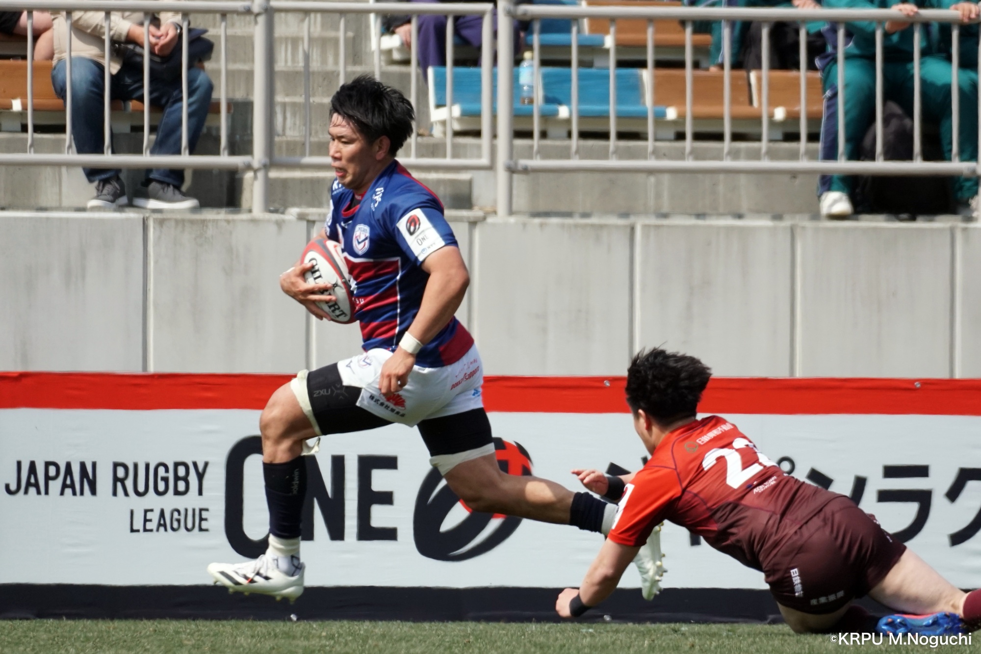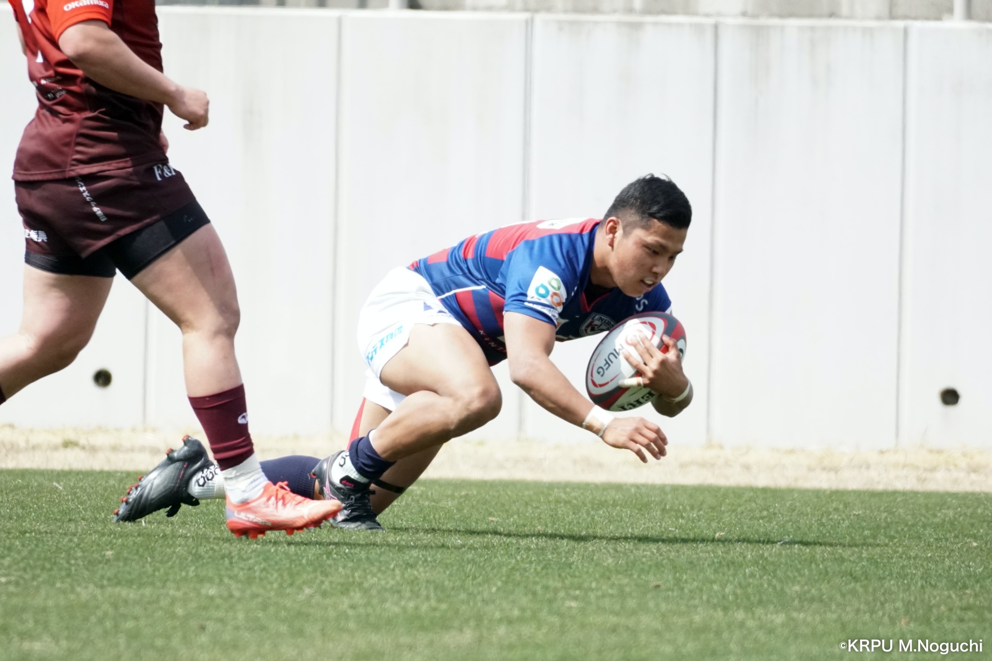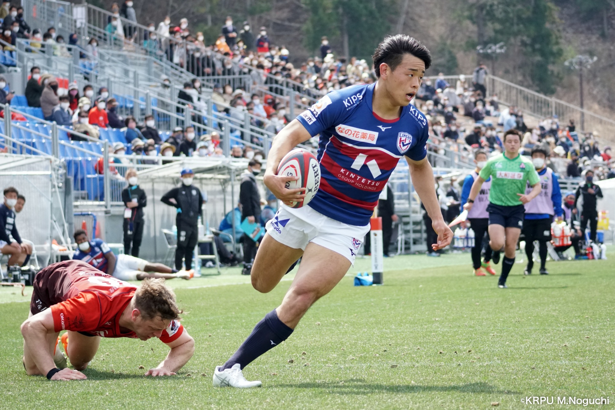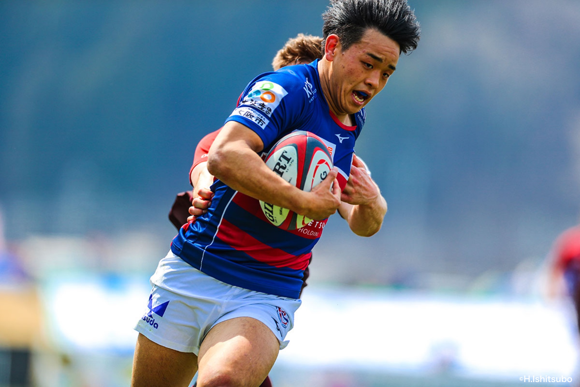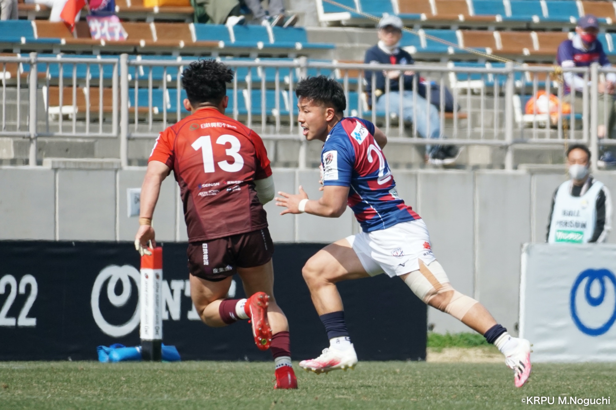 みるみる点差を広げ、67-5で迎えた後半18分。片岡がブレイクスルーすると右へ長いパスを回し、エッジを走る菅原へ渡ってトライ。